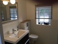 Waschbecken, Regendusche, Spiegel, Fenster im Bad