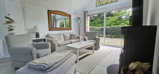TV-Sat, HDTV Flachbildschirm, Bücher, Kaminofen, 2er-Sofa, Sessel