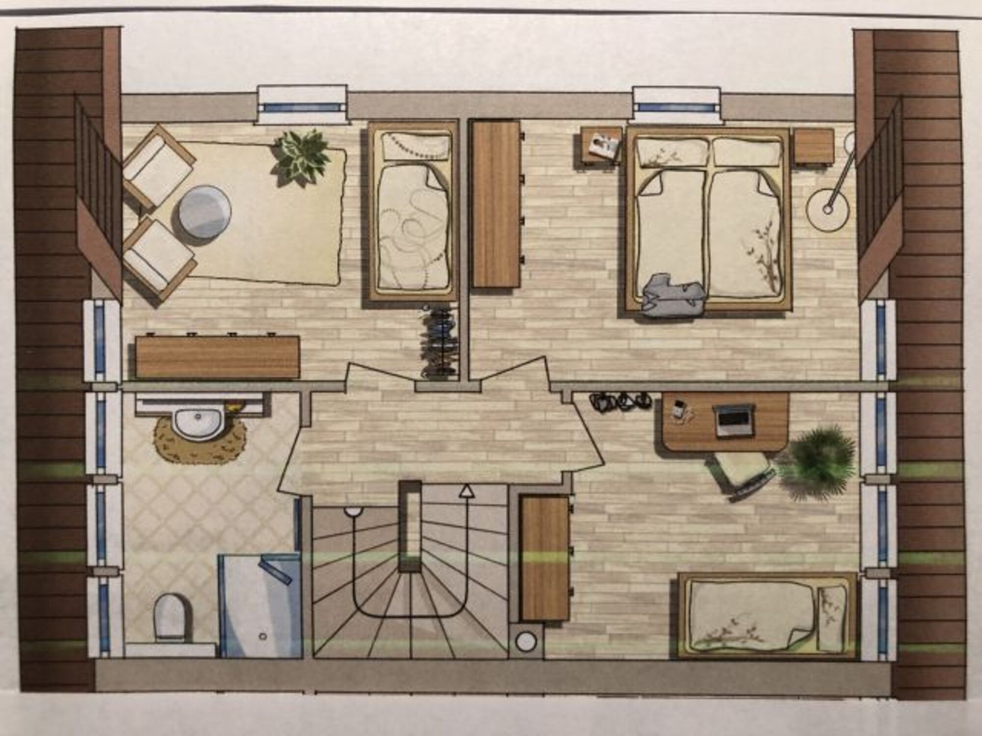 alle Schlafzimmer mit Verdunklungs-Plissees, hochwertig ausgestattetes, geräumiges Badezimmer mit Dusche/WC