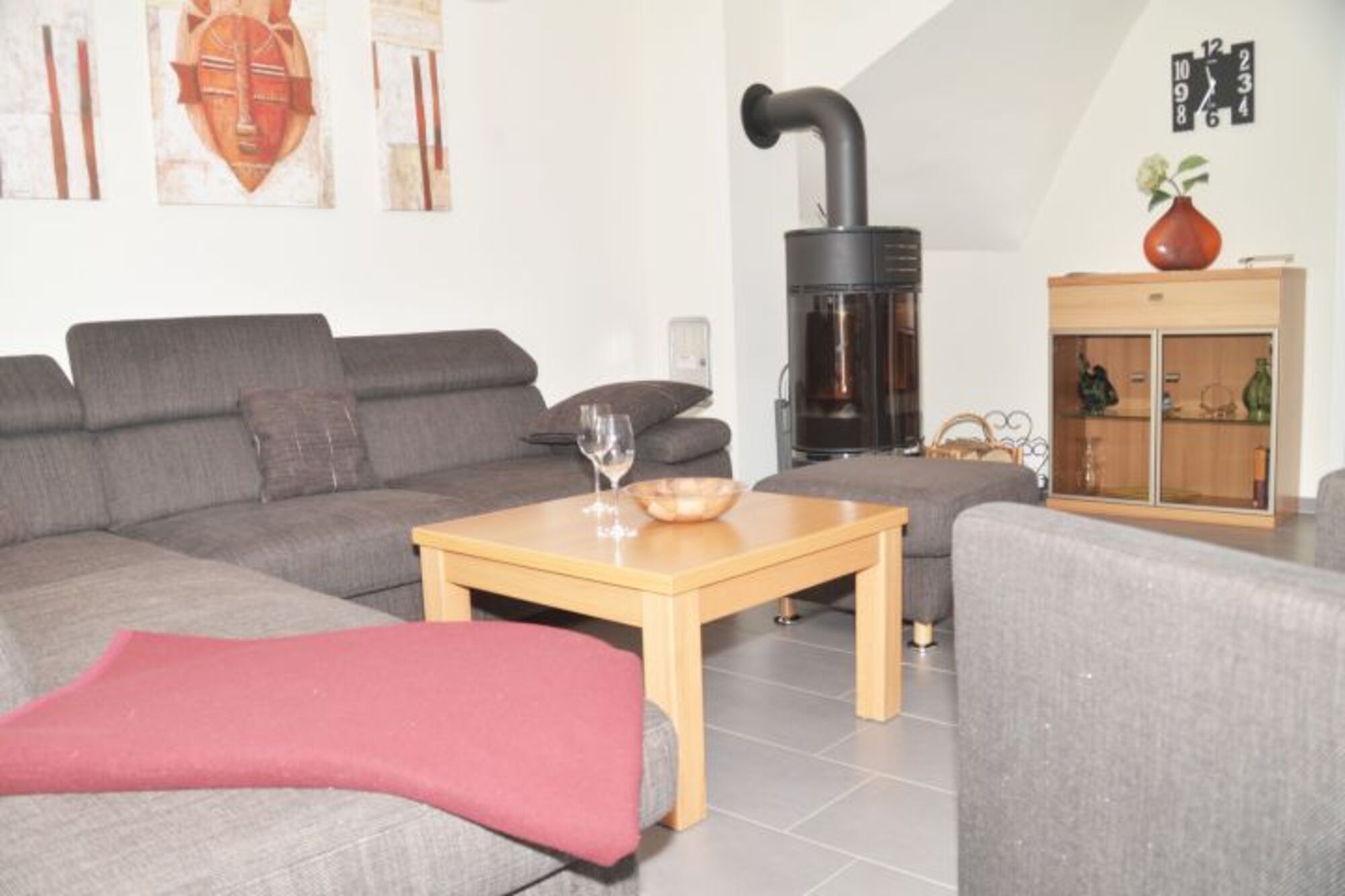 TV, TV-Sat, HDTV Flachbildschirm, Blu-Ray-Player, CD-Player, Bücher, Kaminofen, Eckcouch, Sessel