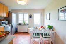Cerankochfeld, Kühlschrank mit Gefrierfach, Gefrierschrank, Küchenmaschine, Mixer, Korkenzieher / Flaschenöffner, Gewürze (Salz, Pfeffer, Zucker), Öl / Essig, Geschirrhandtücher, Mülltüten, Essplatz in der Küche