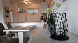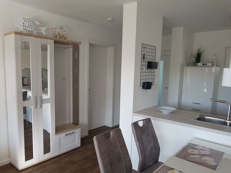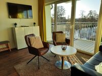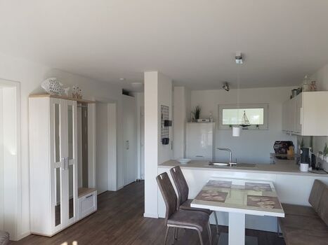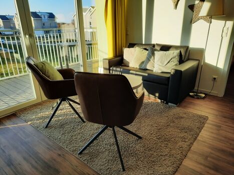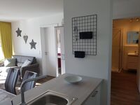 Helle, strandnahe Luxus-Ferienwohnung für bis zu 4 Personen (1 Schlafzimmer plus Ausziehcouch im Wohnzimmer). Das großzügig geschnittene Wellnessbad ist mit einer Infrarotwärmekabine und einer ebenerdigen Dusche ausgestattet. Die Wohnung mit Westausrichtung (Nachmittag- und Abendsonne) verfügt über einen großen Balkon mit Blick auf eine Graft ("Ententeich"). Sie befindet sich in der 1. Etage und ist behindertengerecht mit Aufzug. Das Objekt mit Rezeption ist direkt hinter dem Deich platziert. Der Strand ist ca. 300m, Einkaufsmöglichkeiten und Restaurants 300m entfernt. Die Küche ist komplett ausgestattet und im Wohnzimmer befindet sich ein HD-TV.