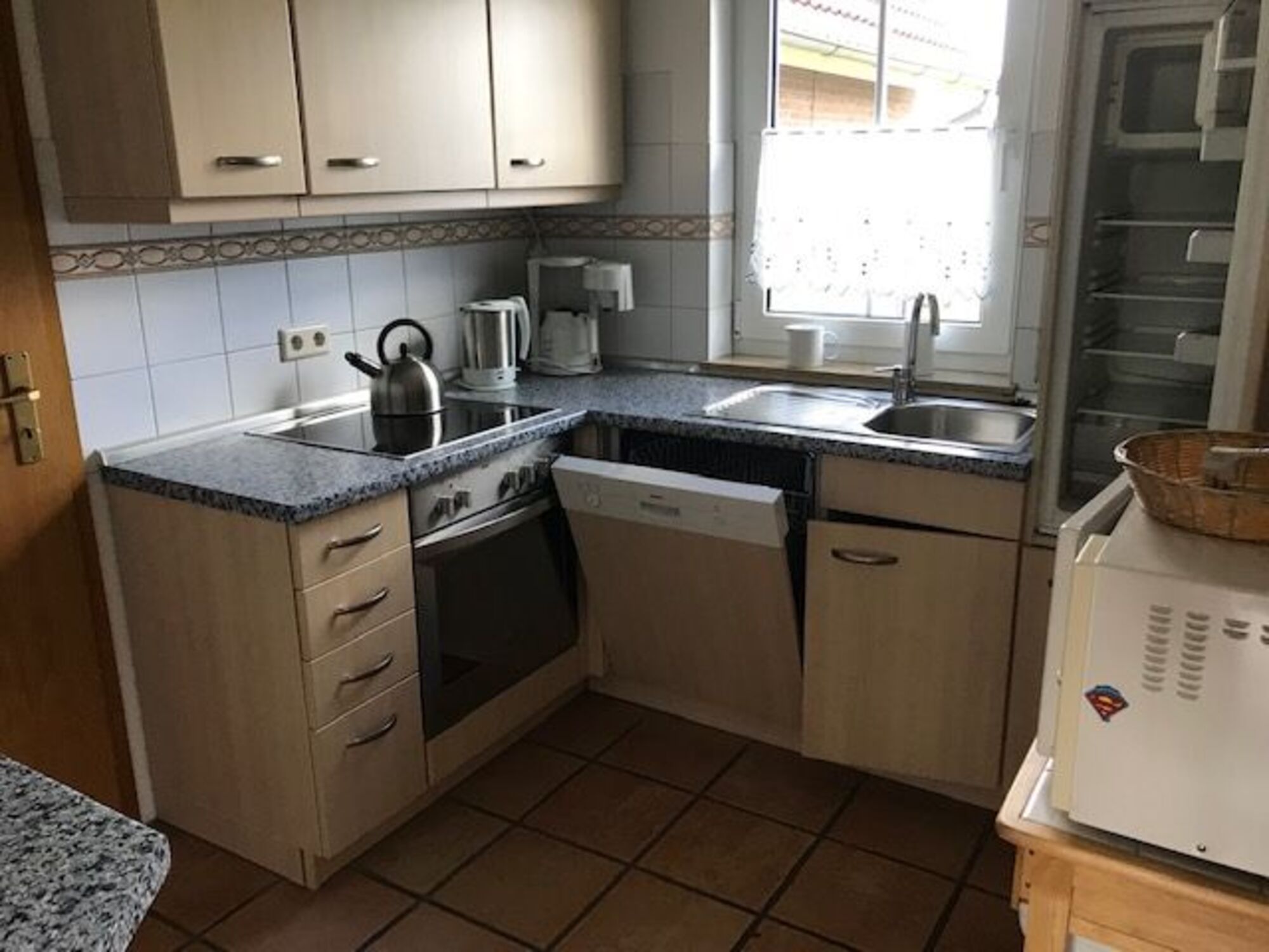 4-Platten Herd, Dunstabzugshaube, Kühlschrank mit Gefrierfach, Eierkocher, Korkenzieher / Flaschenöffner, Gewürze (Salz, Pfeffer, Zucker), Geschirrhandtücher