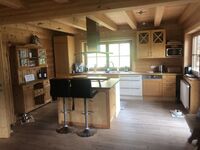 Die liebe- und geschmackvoll eingerichtete "Sonnhüttn" bietet Ihnen auf 192 qm Wohnfläche im Erd- und Obergeschoss alle Annehmlichkeiten eines reinen Holzhauses. Im Erdgeschoss finden Sie den 55 qm großen Wohnbereich mit Kachelofen, Essbereich und offener Küche mit Kochinsel. Daran anschließend gibt es ein Extrazimmer, dass mit einem Schlafsofa und einem Extrafernseher ausgestattet ist. Ebenfalls im Erdgeschoß befindet sich ein Badezimmer mit bodentiefer Dusche, WC und Waschbecken.