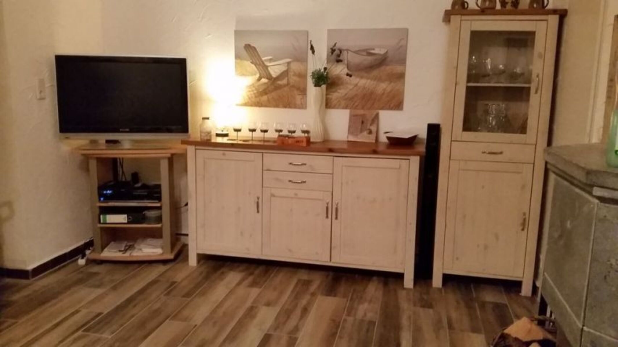4-Platten Herd, Cerankochfeld, Dunstabzugshaube, Gefrierschrank, Senseo-Kaffeeautomat, Eierkocher, Mixer, Korkenzieher / Flaschenöffner, Gewürze (Salz, Pfeffer, Zucker), Öl / Essig, Geschirrhandtücher, Mülltüten, Essplatz in der Küche