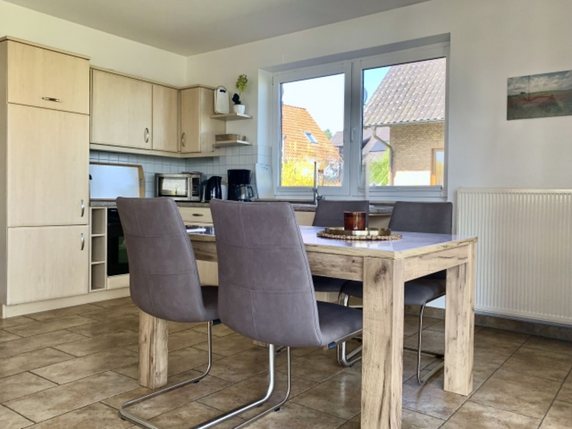 Cerankochfeld, Dunstabzugshaube, Kühlschrank mit Gefrierfach, Korkenzieher / Flaschenöffner, Gewürze (Salz, Pfeffer, Zucker), Geschirrhandtücher, Mülltüten, Essplatz in der Küche