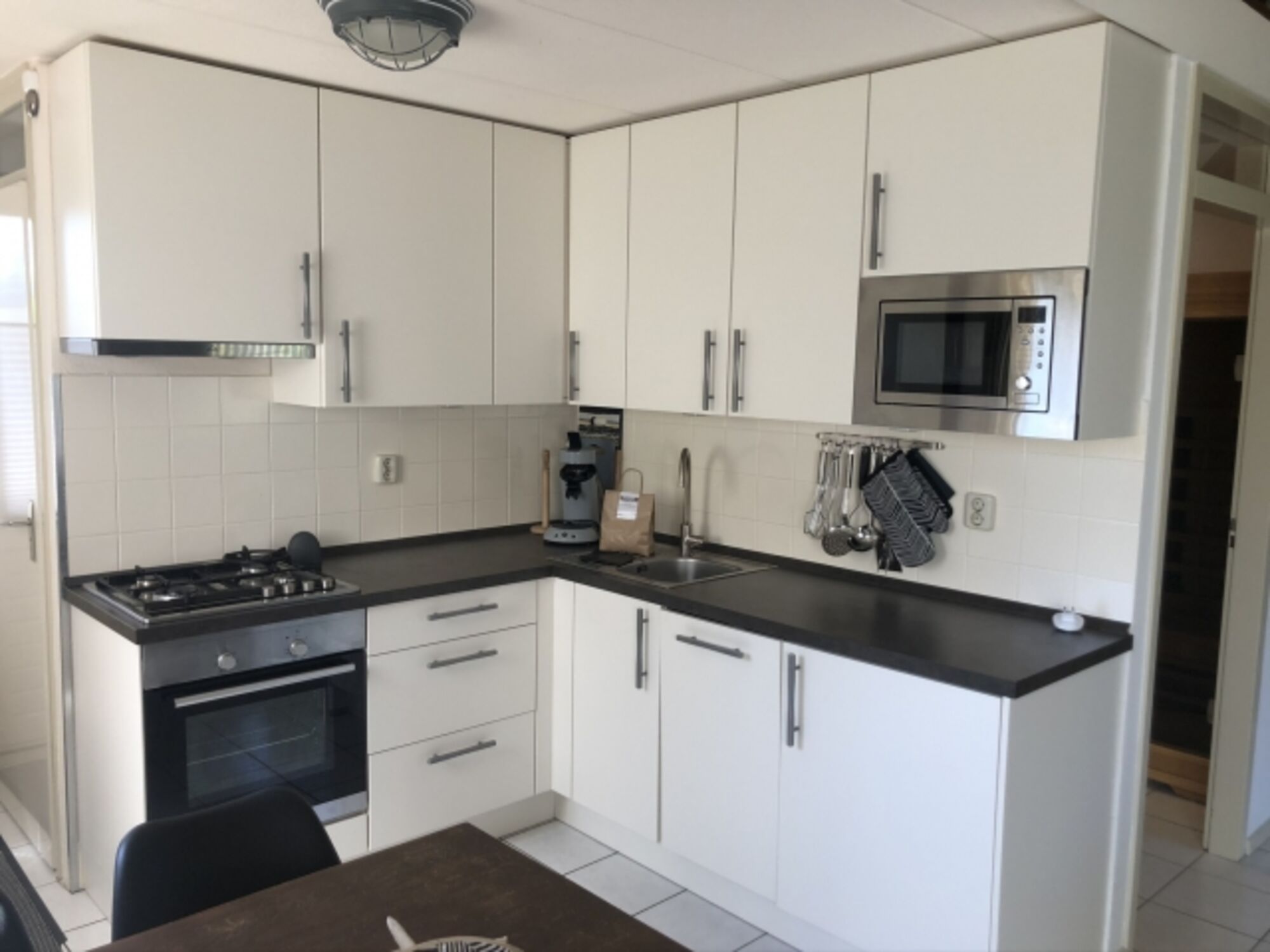 Gasofen / Gasherd, Dunstabzugshaube, Kühlschrank mit Gefrierfach, Senseo-Kaffeeautomat, Eierkocher, Mixer, Korkenzieher / Flaschenöffner, Mülltüten, Essplatz in der Küche, TV in der Küche