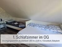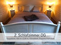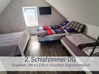 Im UG befindet sich 1 Schlafzimmer mit Doppelbett und TV, Bad mit Dusche und Waschmaschine, vollausgestattete Küche, Wohn-/Eßzimmer, im OG 2 Schlafzimmer und 1 WC. (1 SZ mit Doppelbett, 1 Einzelbett und 1 Kinderbett + WC. 1 SZ mit 1 Doppelbett, 1 Einzelbett und 1 Doppelschlafcouch, TV)