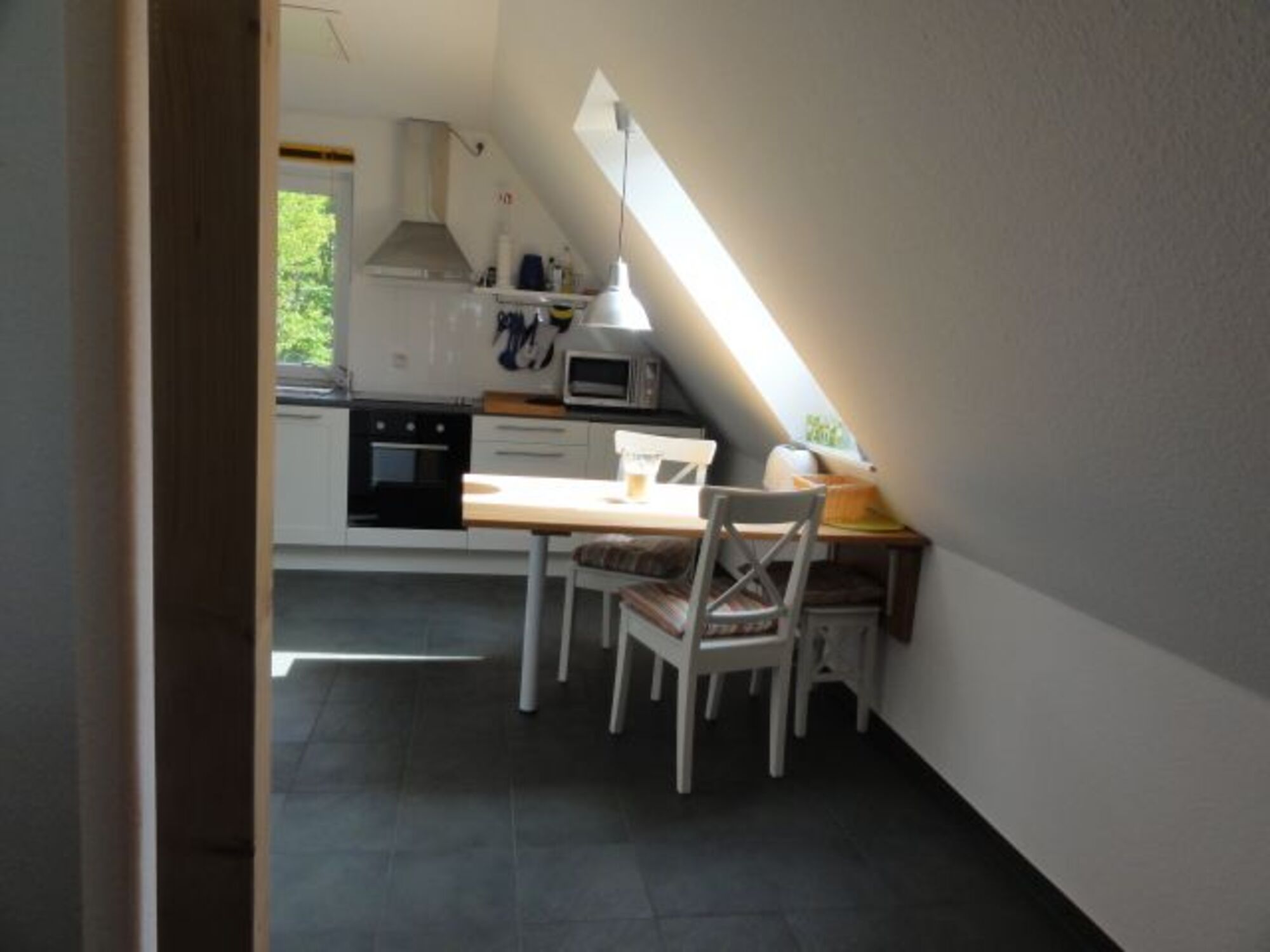 Cerankochfeld, Kühlschrank mit Gefrierfach, Eierkocher, Korkenzieher / Flaschenöffner, Essplatz in der Küche