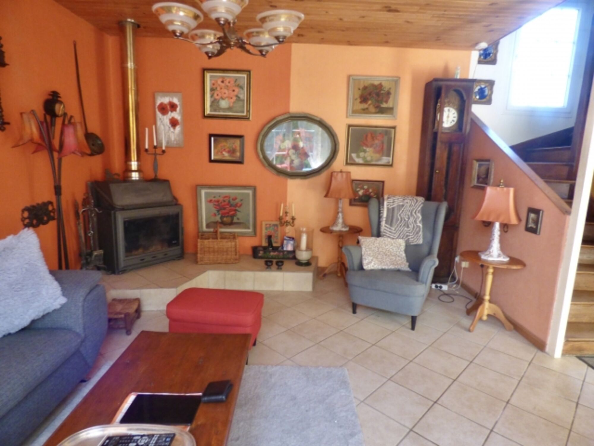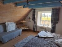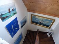 Die Zimmer sind liebevoll eingerichtet und haben ein privates wohnliches Flair. Im Erdgeschoss befindet sich die voll eingerichtete neue Küche, sowie ein großer Eßtisch für 6-7 Personen. Ebenso im Erdgeschoss mit offenem Übergang das Wohnzimmer mit einem Kaminofen, Couch und 2 Sessel. Dort steht auch der TV mit der Sat Anlage. Wlan ist im ganzen Haus verfügbar. Das Treppenhaus führt in den 1. Stock in das erste Schlafzimmer mit Blick zum Meer.