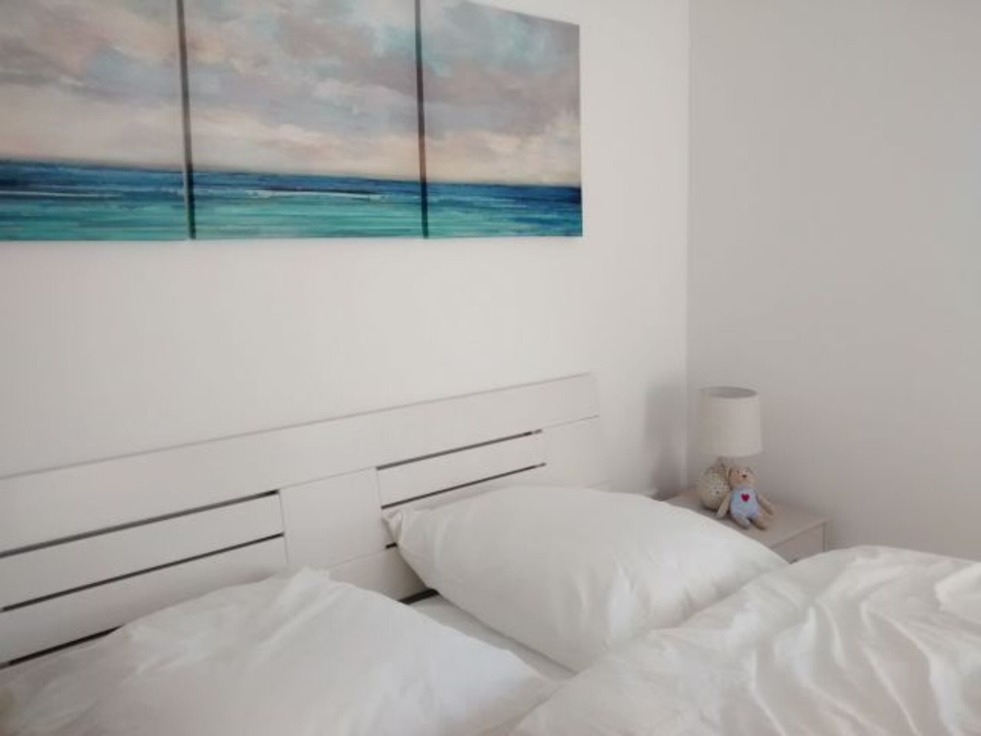 Die beiden Schlafzimmer sind jeweils mit Doppelbetten ausgestattet. Die ergonomischen Matratzen bieten nach langen Strandtagen wohligen Schlafkomfort. Bodentiefe Fenster mit Meerblick sind mit dunklen Vorhängen für die Nachtruhe bestens zu verdunkeln.