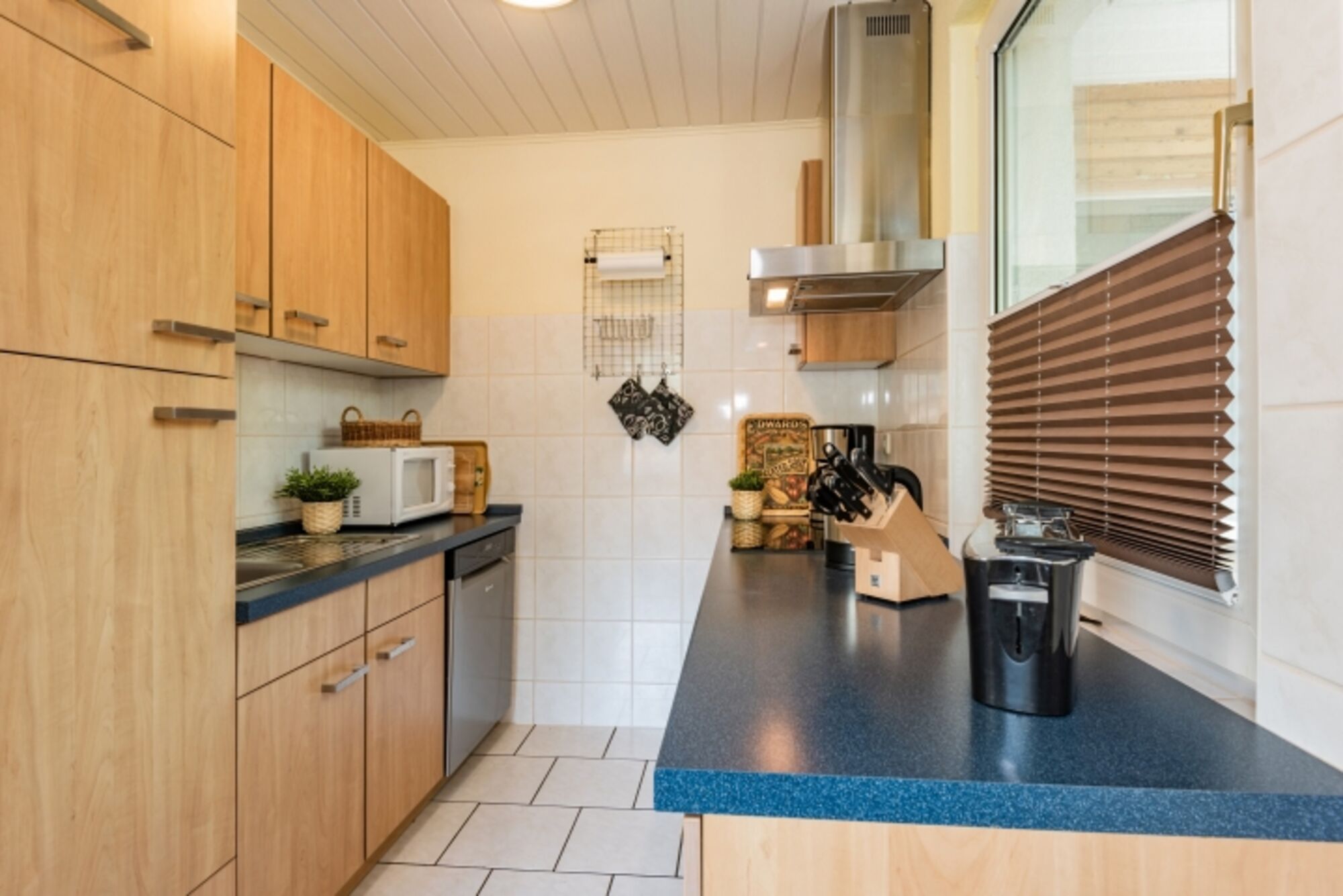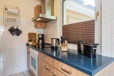 4-Platten Herd, Dunstabzugshaube, Kühlschrank mit Gefrierfach, Eierkocher, Mixer, Korkenzieher / Flaschenöffner, Gewürze (Salz, Pfeffer, Zucker), Geschirrhandtücher, Mülltüten