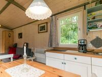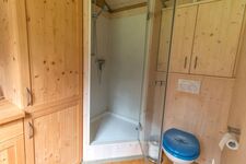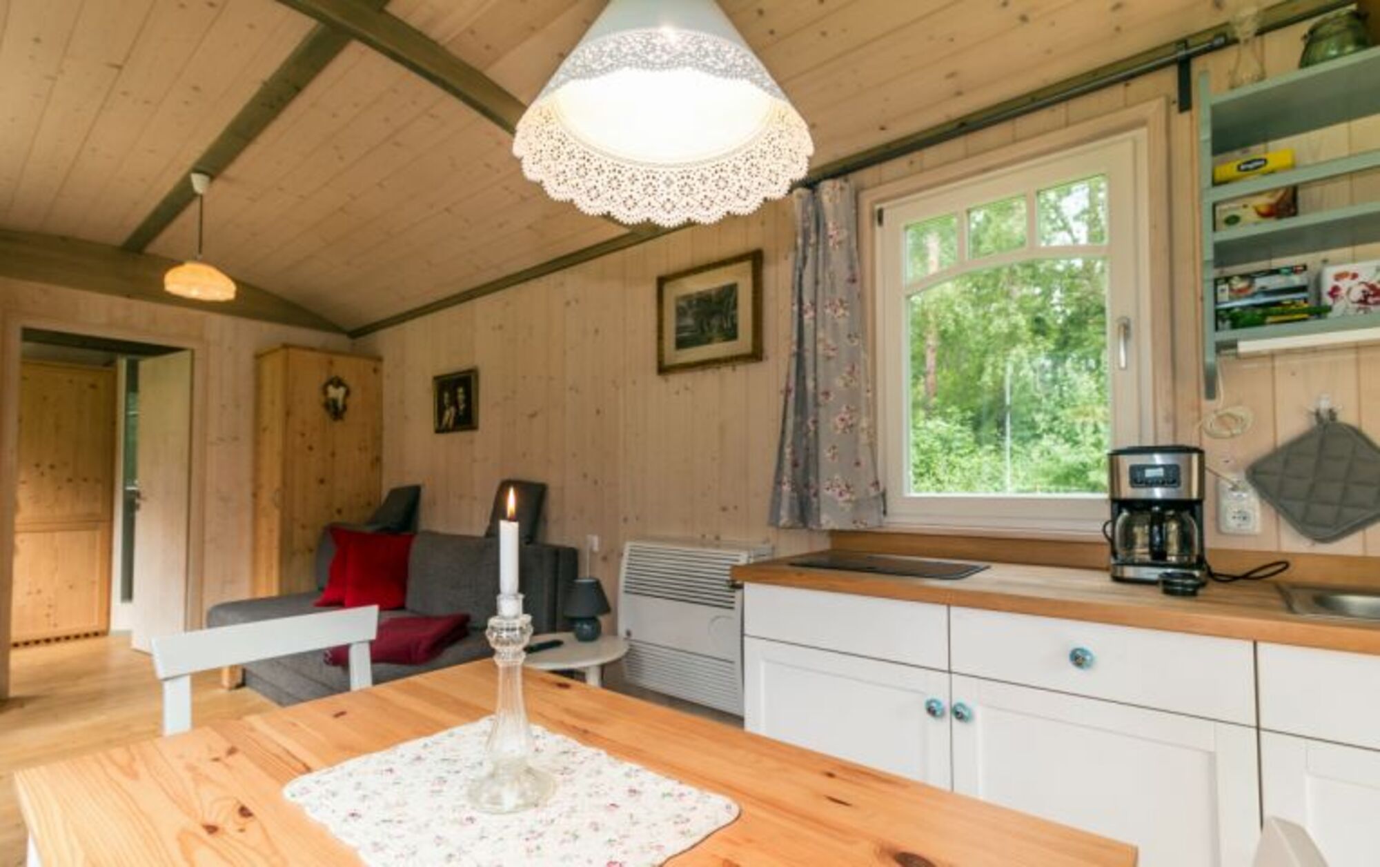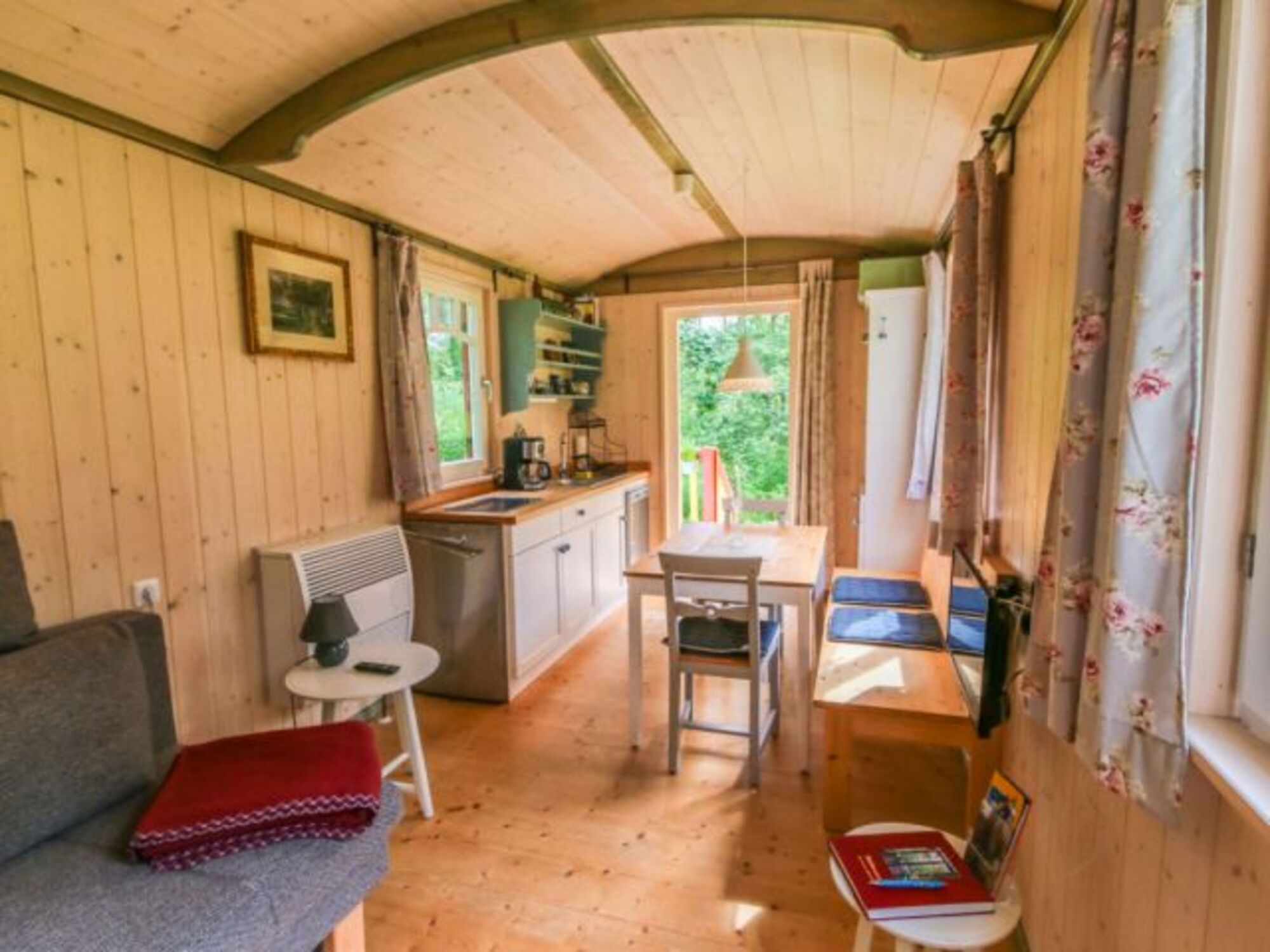 Waschbecken, Dusche, WC, Küche mit allen Selbstverständlichkeiten wie Toaster, Kaffeemaschine, Wasserbereiter, Kühlschrank, Zweiflammen-Gaskocher und TV. Für kühle Tage und Nächte gibt es eine Gasheizung. Ihr bequemes Sofa verwandelt sich nachts in ein Bett.