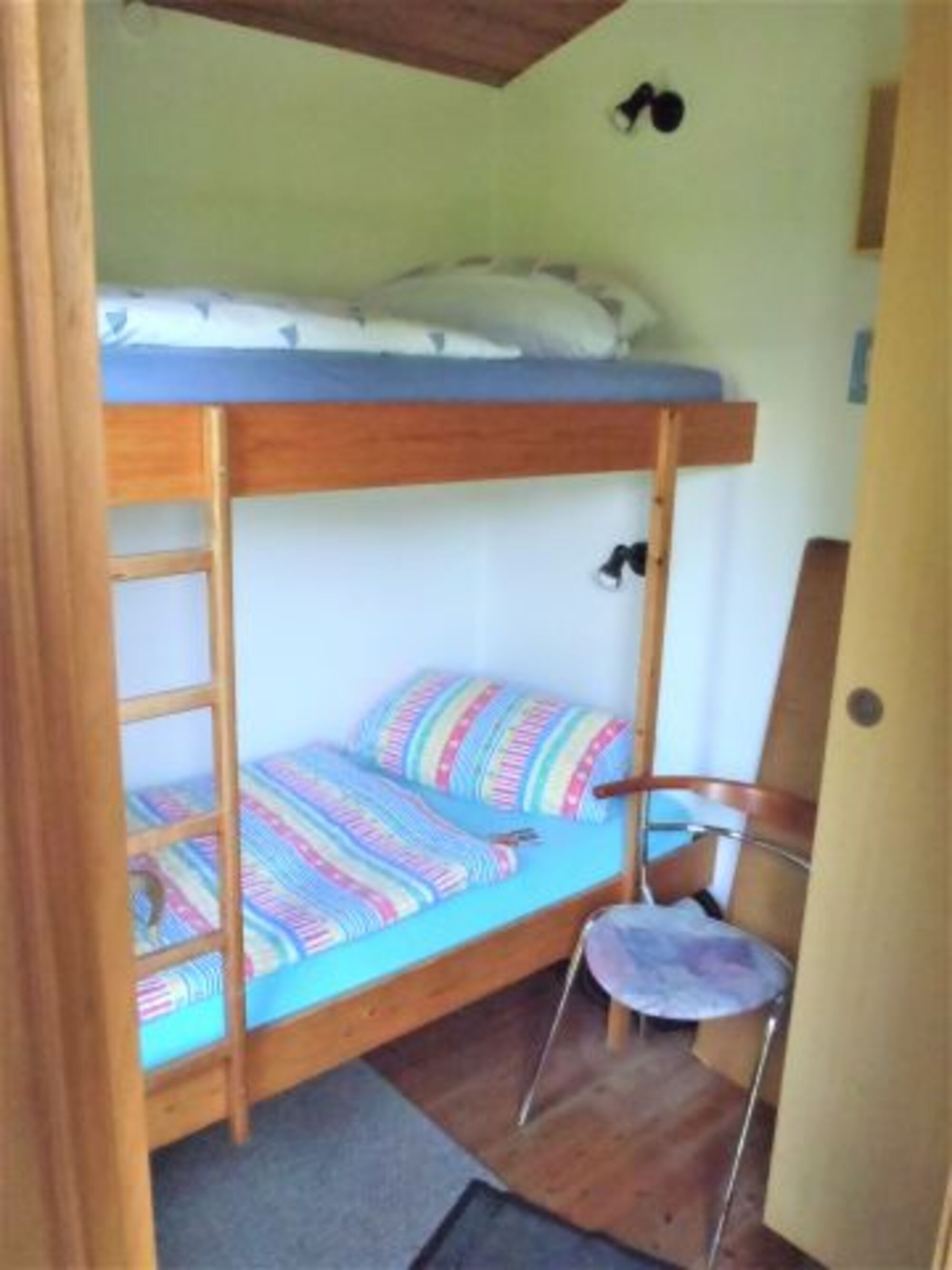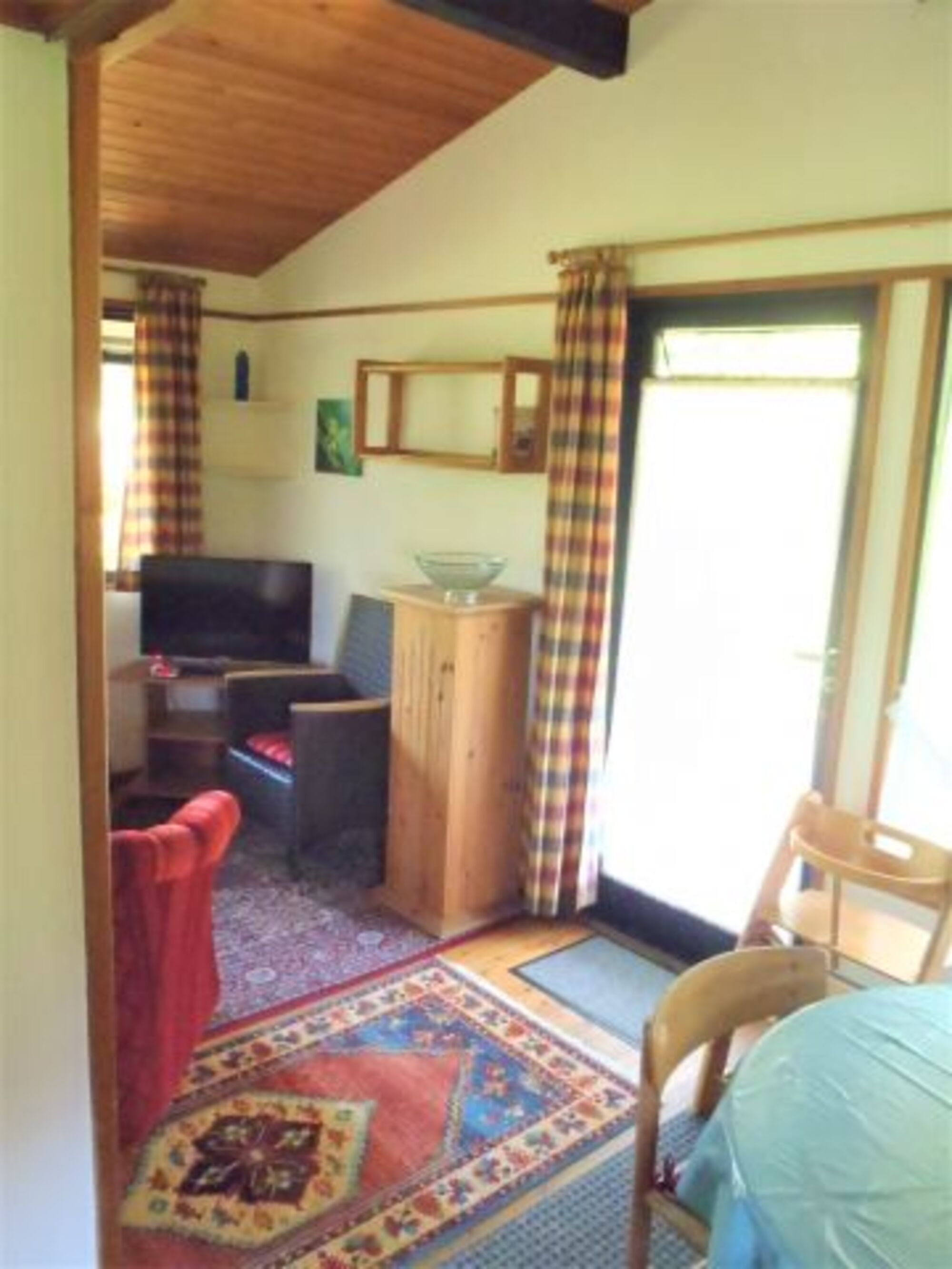 Unsere "Retro Chalets" haben ein Schlafzimmer mit gemütlichen Doppelbetten (1,4x2,0m Liegefläche) und ein Schlafzimmer mit Kinder Etagenbett (90x190cm). Ein gemütliches Wohnzimmer mit Küche und ein schnuckeliges Badezimmer mit Dusche runden Ihr Reich für Ihren Urlaub ab. Jedes Haus hat eine eigene Terrasse und Terrassenmöbel. Ihre Hund können Sie an der Leine an der Terrasse anbinden .