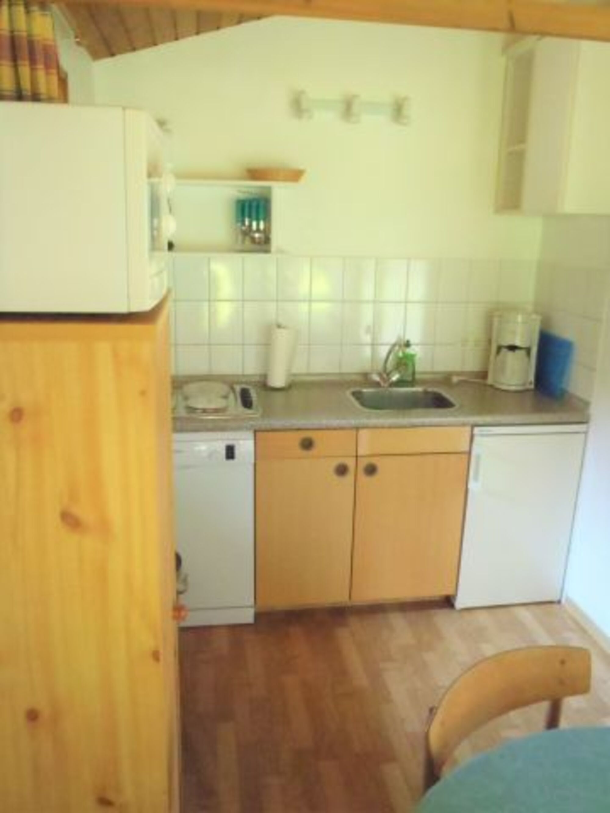 4-Platten Herd, Kühlschrank mit Gefrierfach, Korkenzieher / Flaschenöffner, Geschirrhandtücher, Mülltüten, Essplatz in der Küche