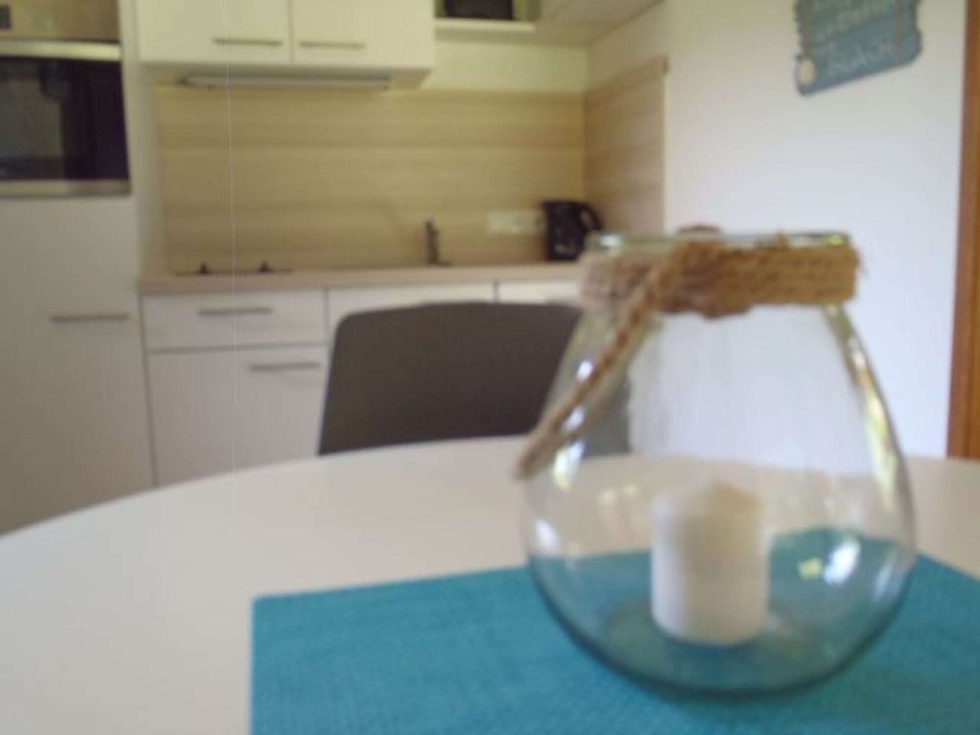 2-Platten Herd, Kühlschrank mit Gefrierfach, Senseo-Kaffeeautomat, Korkenzieher / Flaschenöffner, Geschirrhandtücher, Mülltüten, Essplatz in der Küche