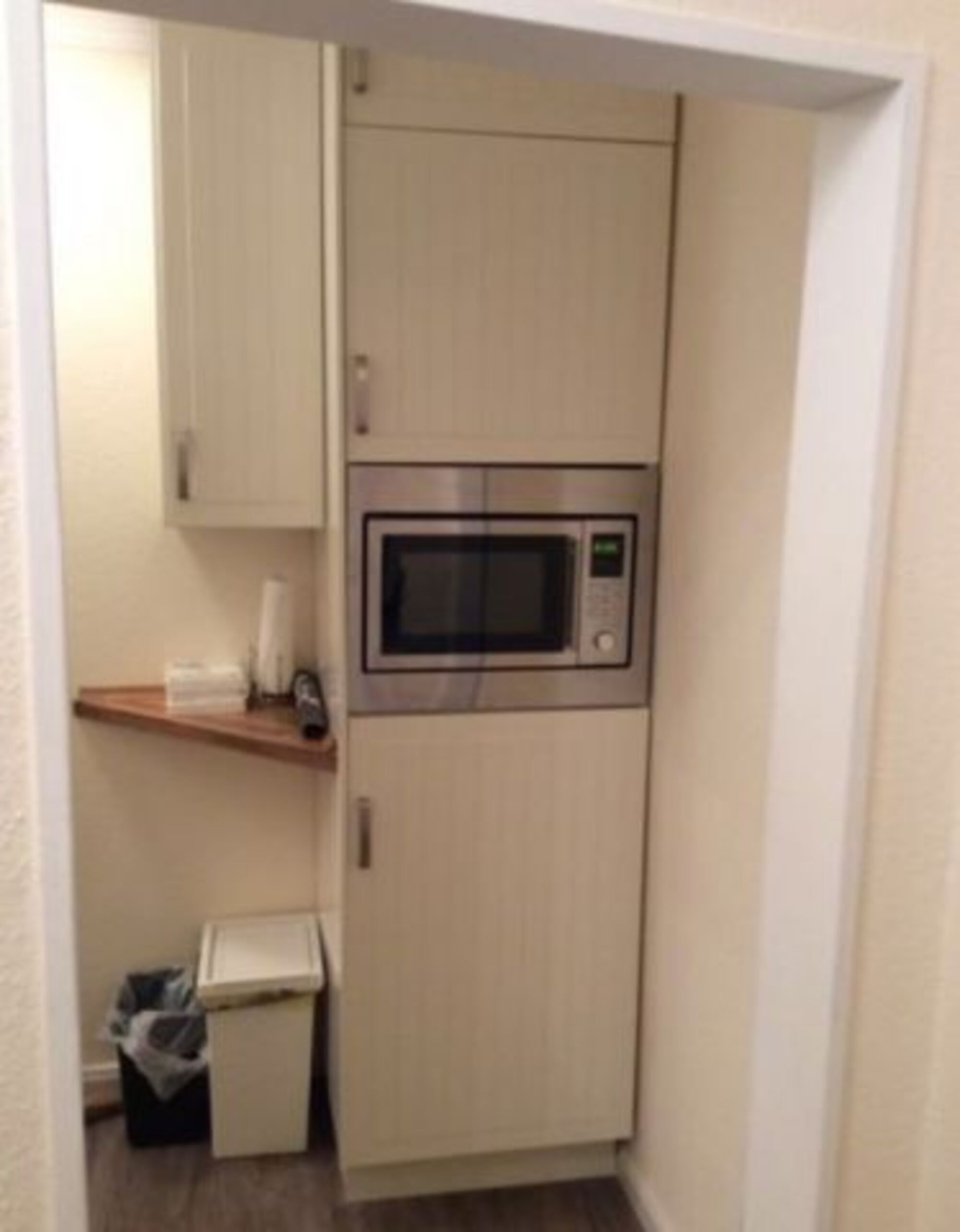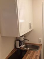 Das 27 qm große Appartement ist mit einer Einbauküche mit Kühlschrank, Induktionsfeld und Mikrowelle mit Heißluft ausgestattet, sowie Kaffeemaschine, Toaster und Wasserkocher.