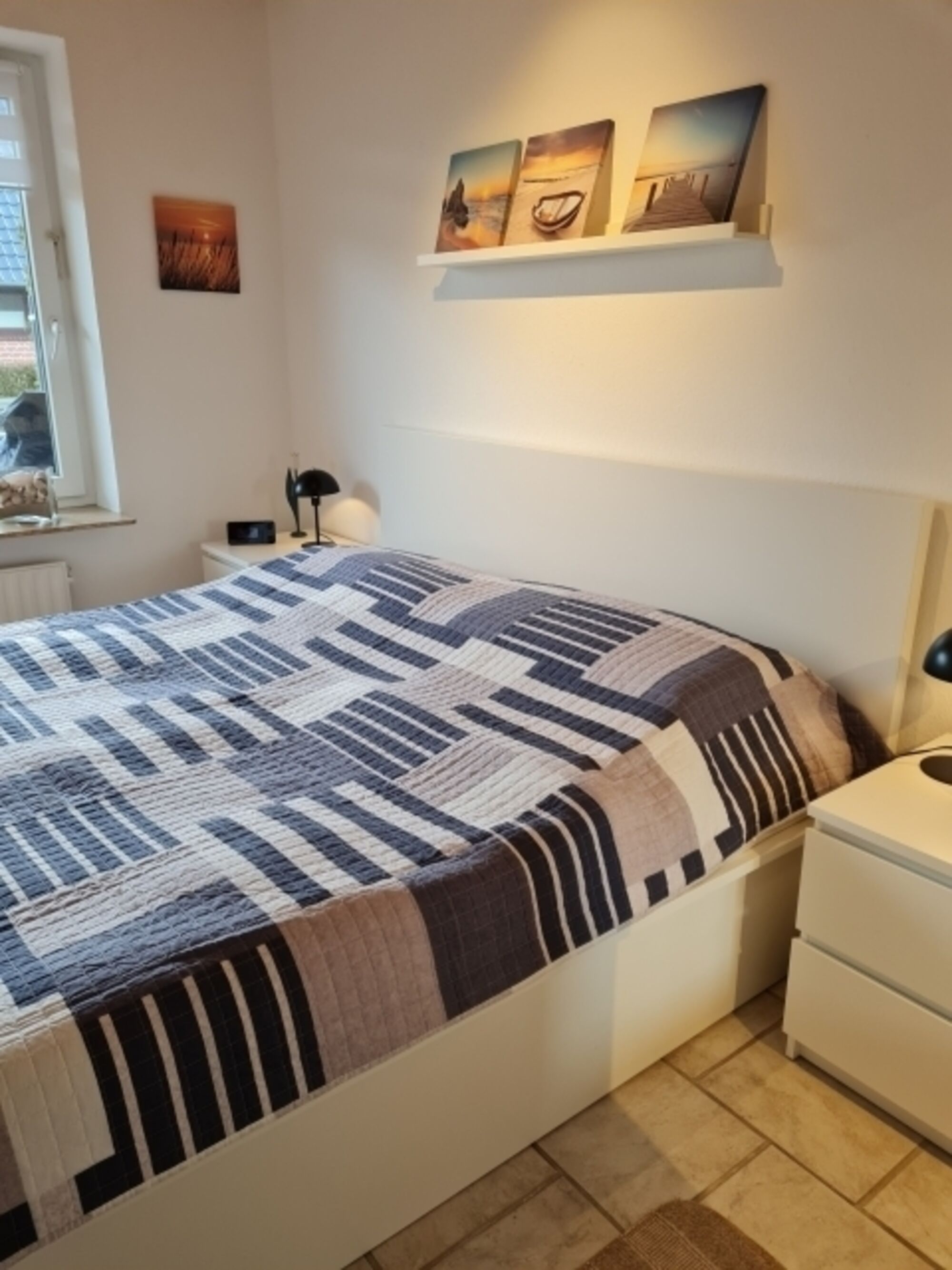 Ein gemütliches Schlafzimmer, das ebenfalls im skandinavischen Stil möbliert ist. Das Doppelbett ist mit 2 Einzelmatratzen 90 x 200 cm ausgestattet (2019) und lädt zu einem erholsamen Schlaf ein. Abends gemütlich aus dem Bett fernsehen, bei uns ist das seit 2024 möglich. Das Fenster ist mit Verdunklungsplisees ausgestattet. Bettwäsche und Laken bringen unsere Gäste bitte selber mit. Paare haben in unserer Wohnung die Möglichkeit getrennt zu schlafen, das 2.Schlafzimmer verfügt über ein Einzelbett (90 x 200cm). Doppelbett 1,80 x 2,00m, Kommode, Wecker, Spiegel, Leselampe am Bett, Fliegengitter