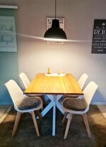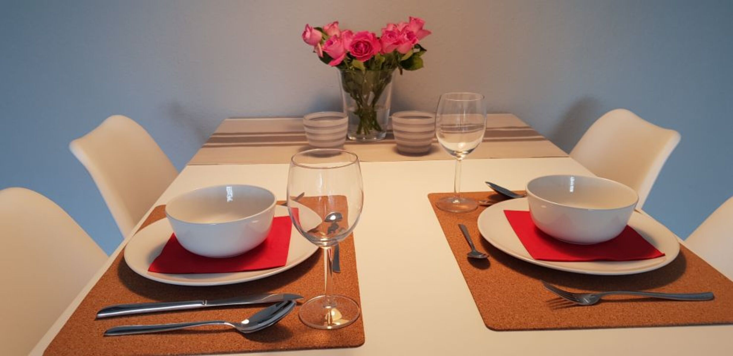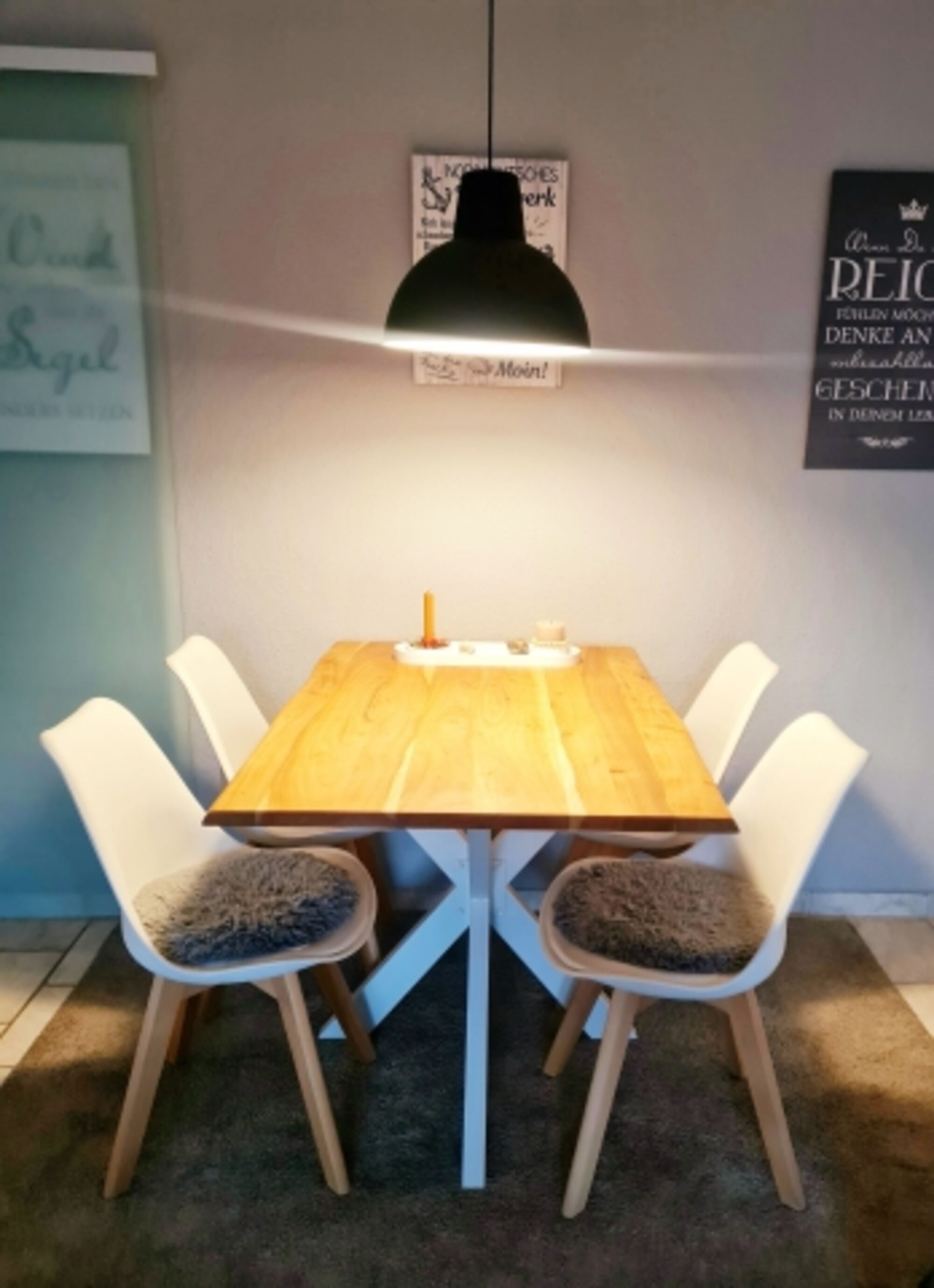Die Wohnung ist im skandinavischen Stil möbliert und komplett mit Pütt und Pan und ausreichend Geschirr und Besteck ausgestattet.