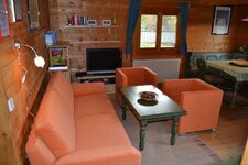 Schöner Wohn- und Essbereich eingerichtet mit 3er-Sofa und Einzelsitzer, Wohnwand mit Büchern und Accessoires, Flach-TV-81 cm, Sony Playstation 2, DVD-Recorder, Radio-CD-Player, grossem Essbereich mit Ecksitzbank und Stühlen, Kommode und Schuhschrank. WLAN-Router im Haus. Dies kann gegen geringe Gebühr genutzt werden.