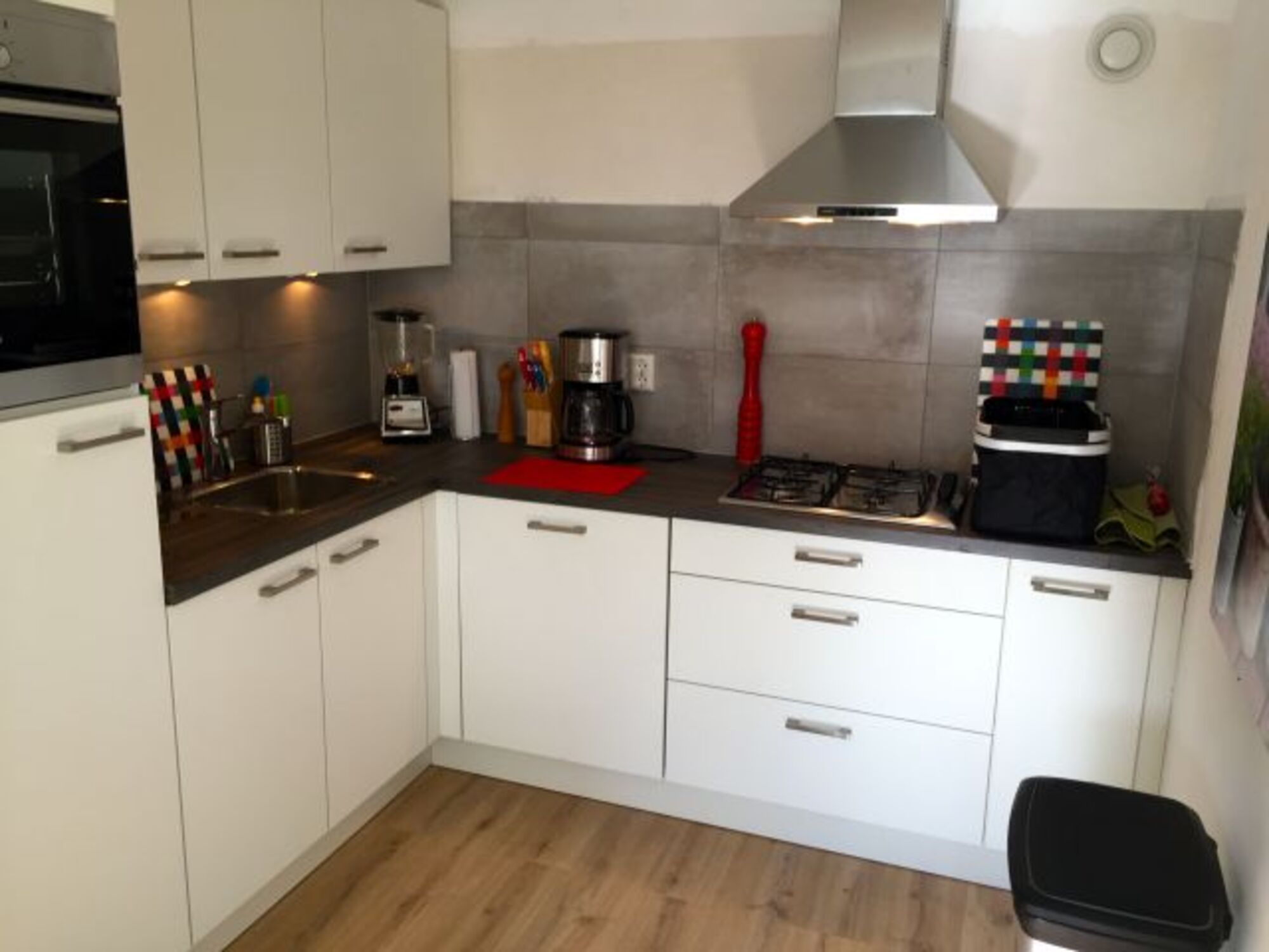 Gasofen / Gasherd, Dunstabzugshaube, Kühlschrank mit Gefrierfach, Gefrierschrank, Senseo-Kaffeeautomat, Nespresso-Automat, Eierkocher, Mixer, Waffeleisen, Korkenzieher / Flaschenöffner, Gewürze (Salz, Pfeffer, Zucker), Geschirrhandtücher