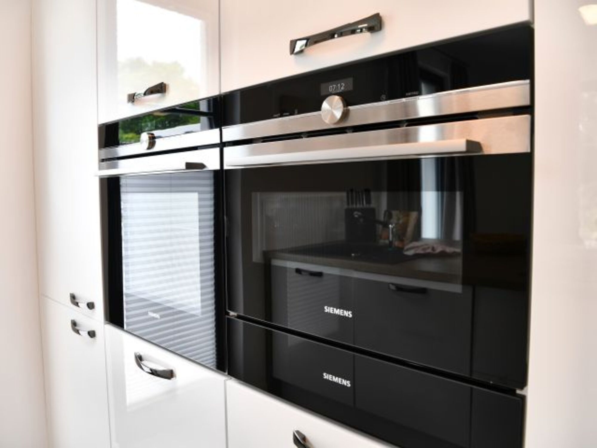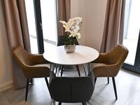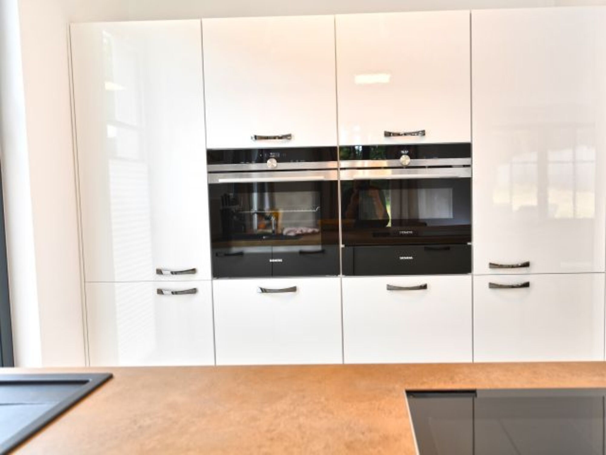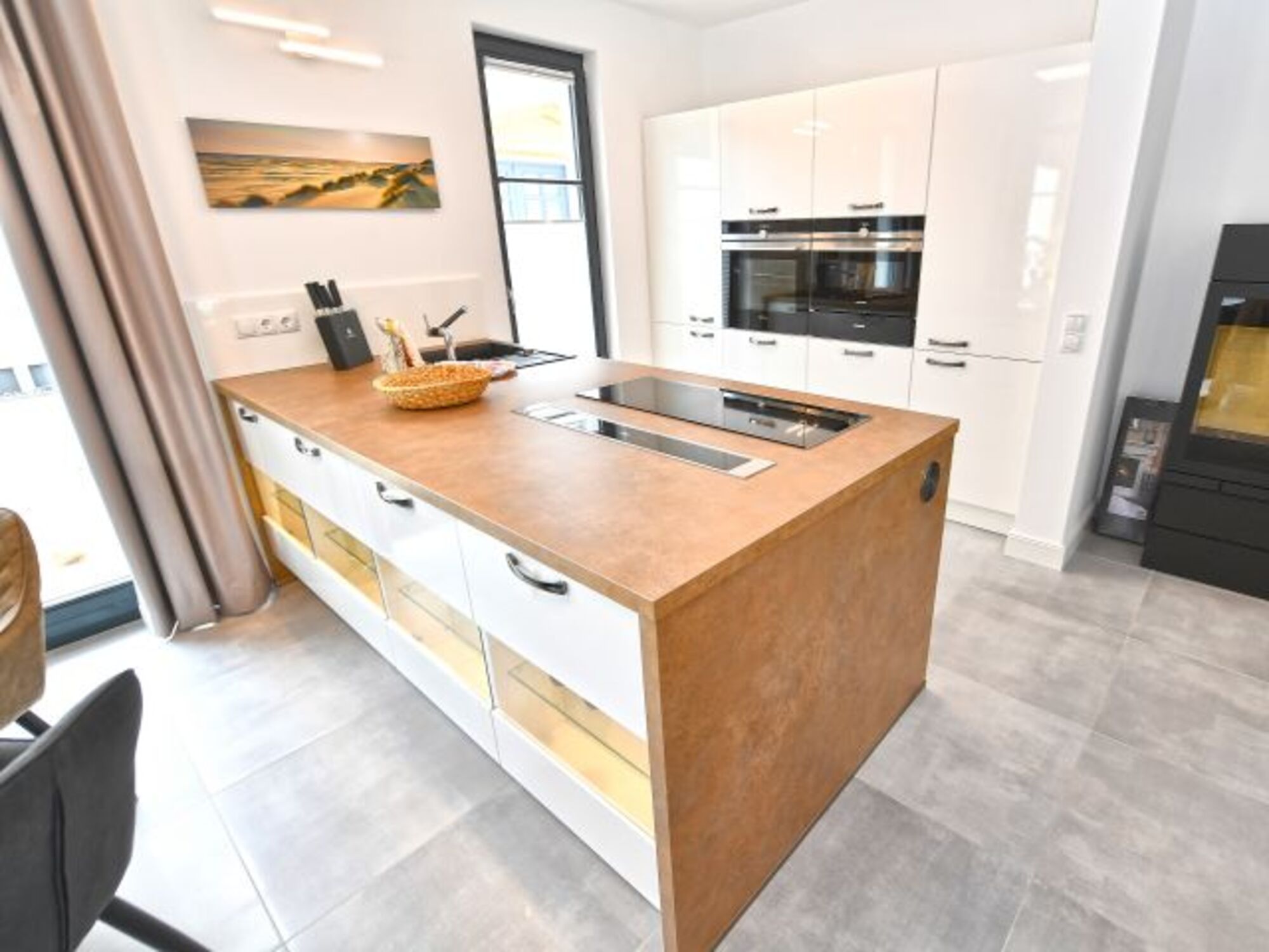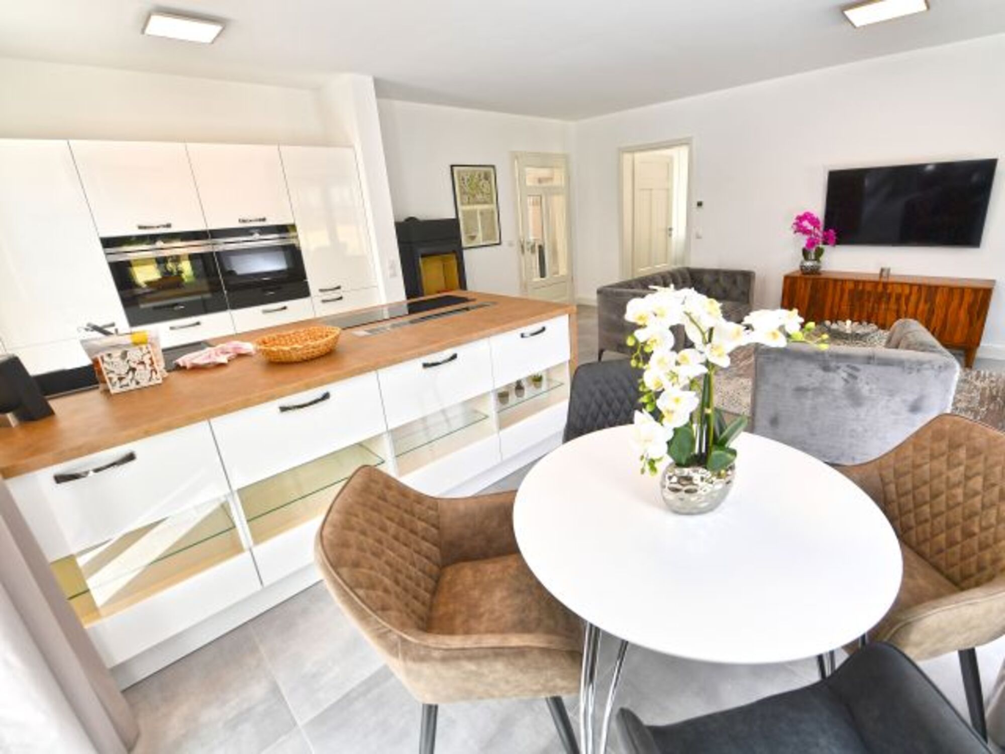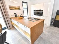 Der Essbereich und der Küchenblock sind im Wohnbereich integriert. Voll ausgestattet mit Markengeräten von Siemens und WMF, können Sie sich hier nach Herzenslust bekochen.