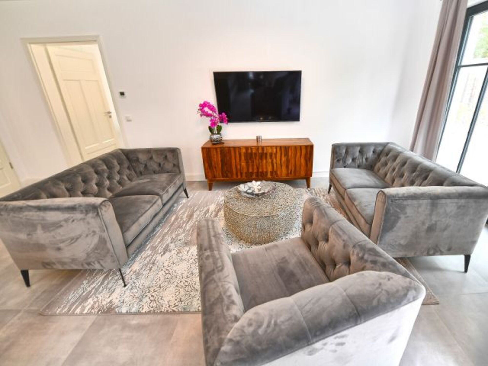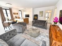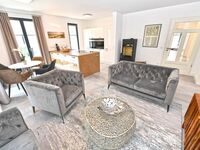 Im Wohnzimmer erwarten Sie exklusive Sitzmöbel, modernste Unterhaltungstechnik und eine stimmige Beleuchtung. Durch die bodentiefen Fenster fällt der Blick auf die vorgelagerte Terrasse, auf der komfortable Gartenmöbel zum Relaxen einladen.