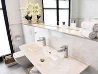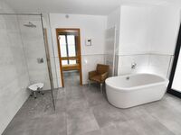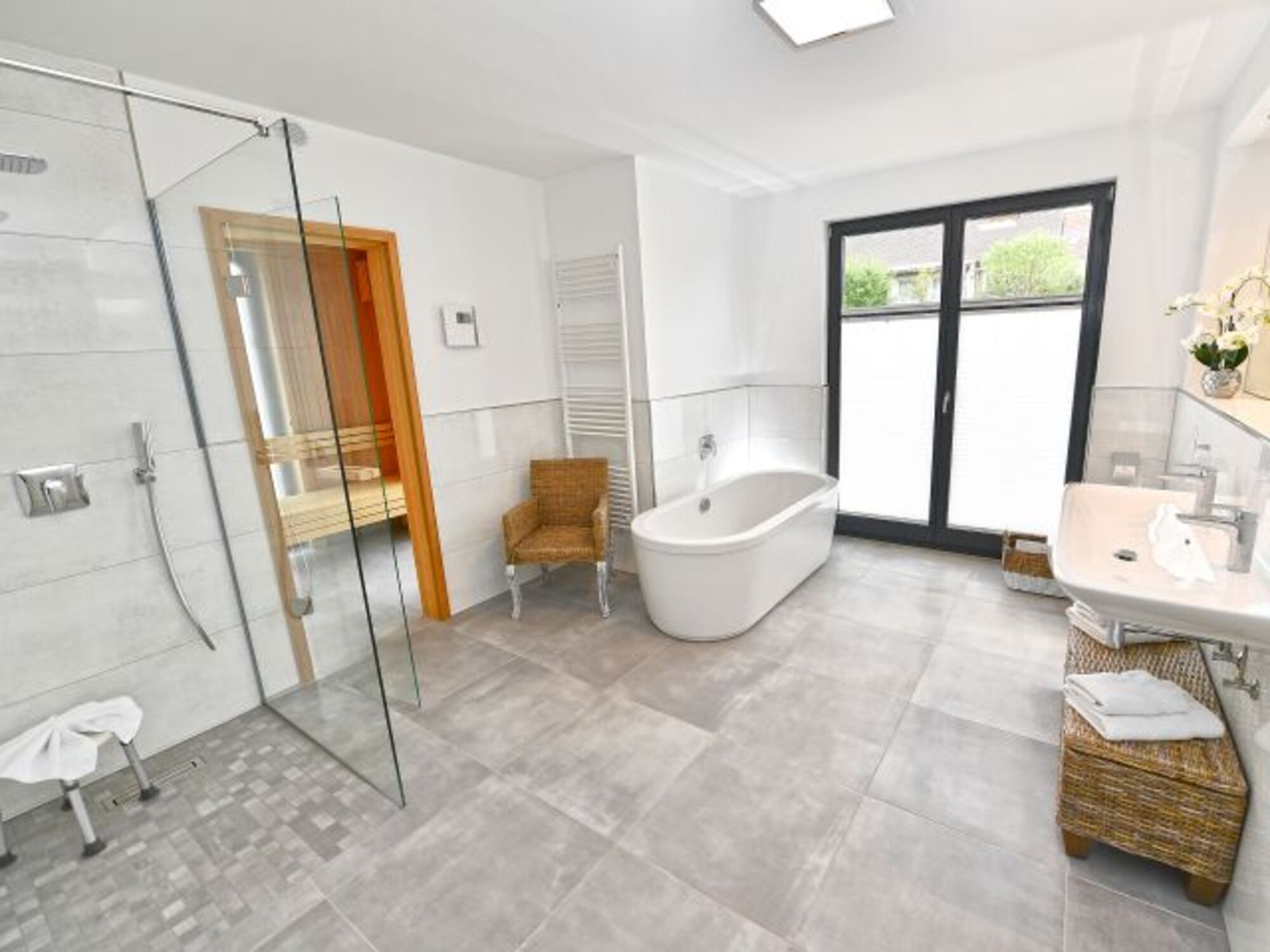 Das große Badezimmer verfügt über freistehende Badewanne, Dusche, Doppelwaschtisch, WC und Ihre ganz private Finnische Sauna.