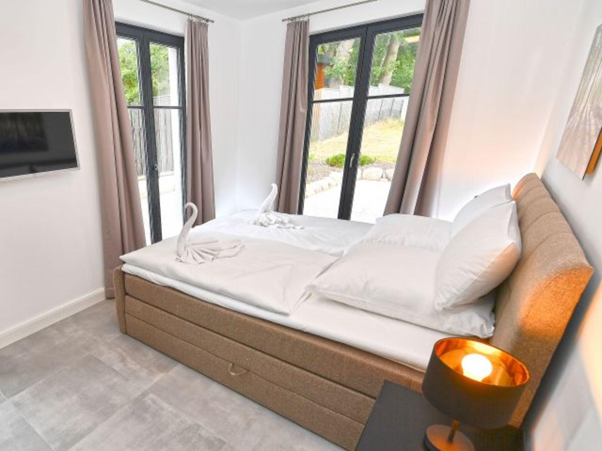 Die beiden Schlafzimmer Ihres Urlaubsdomizils sind mit jeweils einem Boxspring-Doppelbett (1,80 x 2,00m), einem Kleiderschrank für Ihre Urlaubsgarderobe sowie einem zusätzlichem Fernseher ausgestattet.