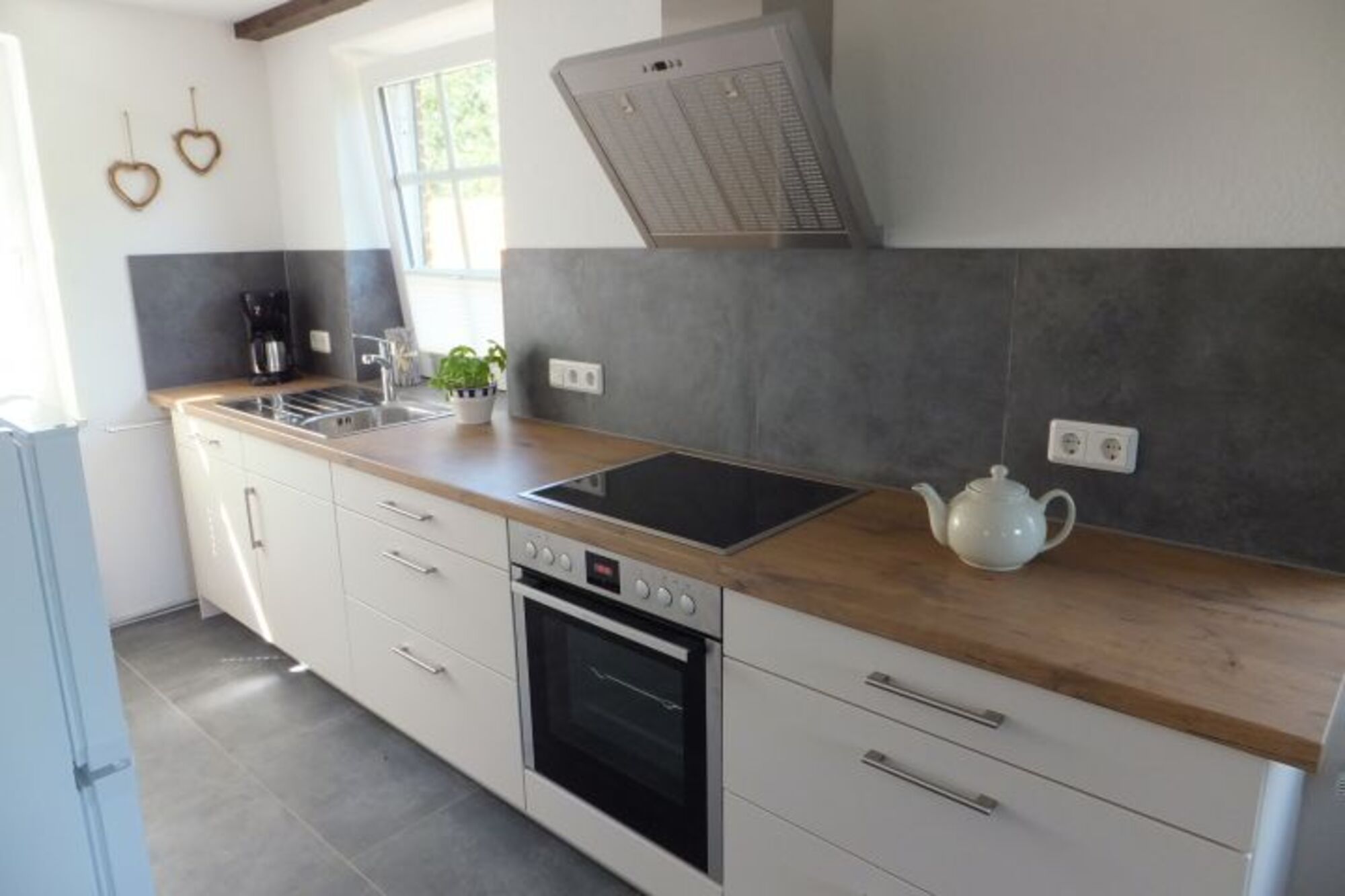 Cerankochfeld, Dunstabzugshaube, Kühlschrank mit Gefrierfach, Kaffeevollautomat, Mixer, Korkenzieher / Flaschenöffner, Geschirrhandtücher, Mülltüten, Essplatz in der Küche