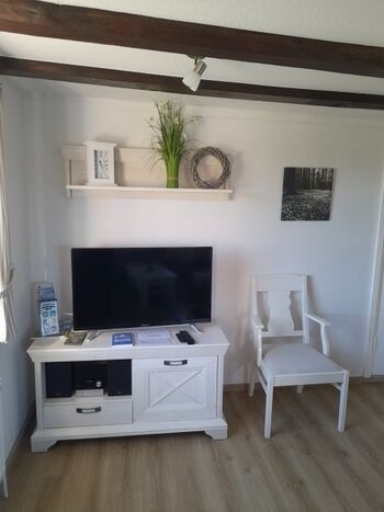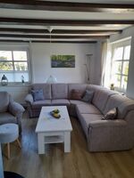 TV-Sat, TV-Flachbildschirm, CD-Player, Kaminofen, Eckcouch, Sessel