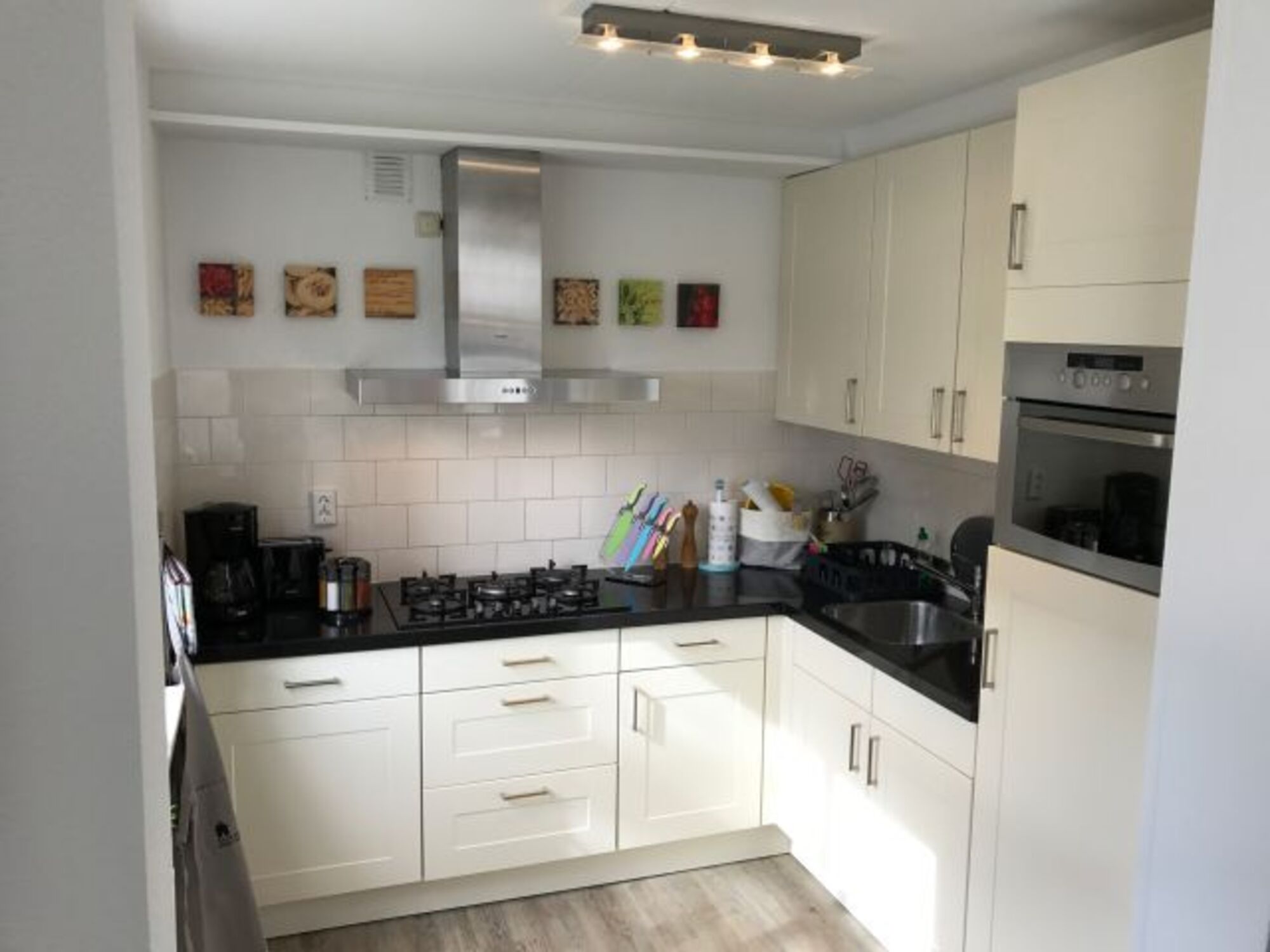Gasofen / Gasherd, Dunstabzugshaube, Kühlschrank mit Gefrierfach, Mixer, Waffeleisen, Korkenzieher / Flaschenöffner, Geschirrhandtücher