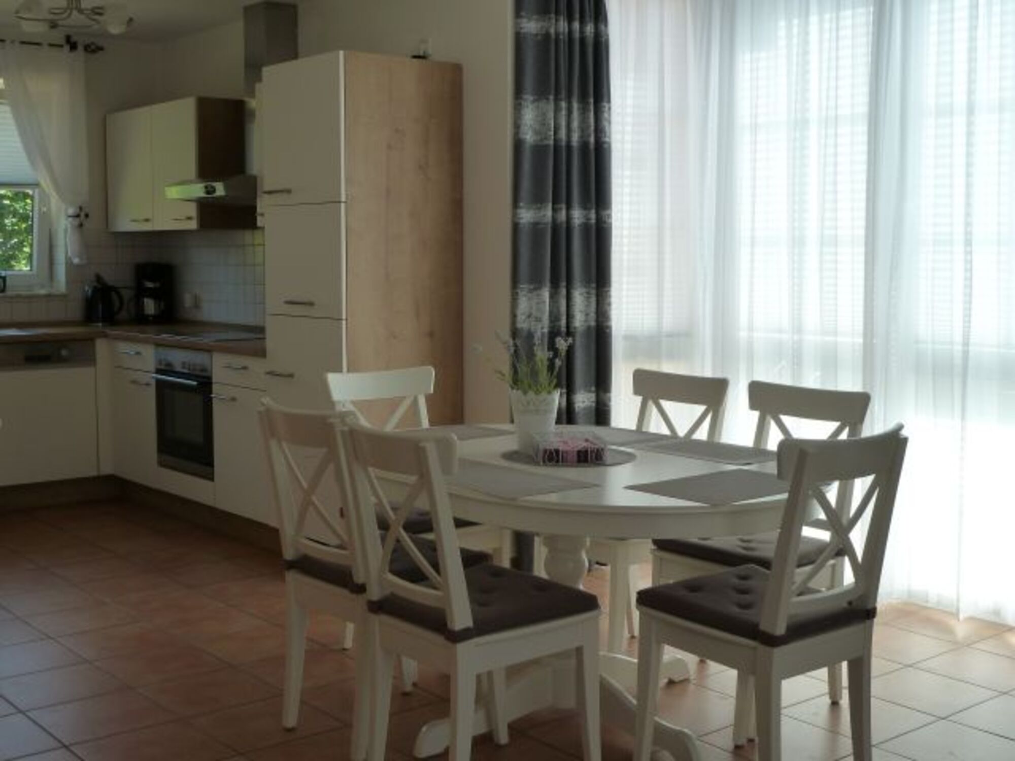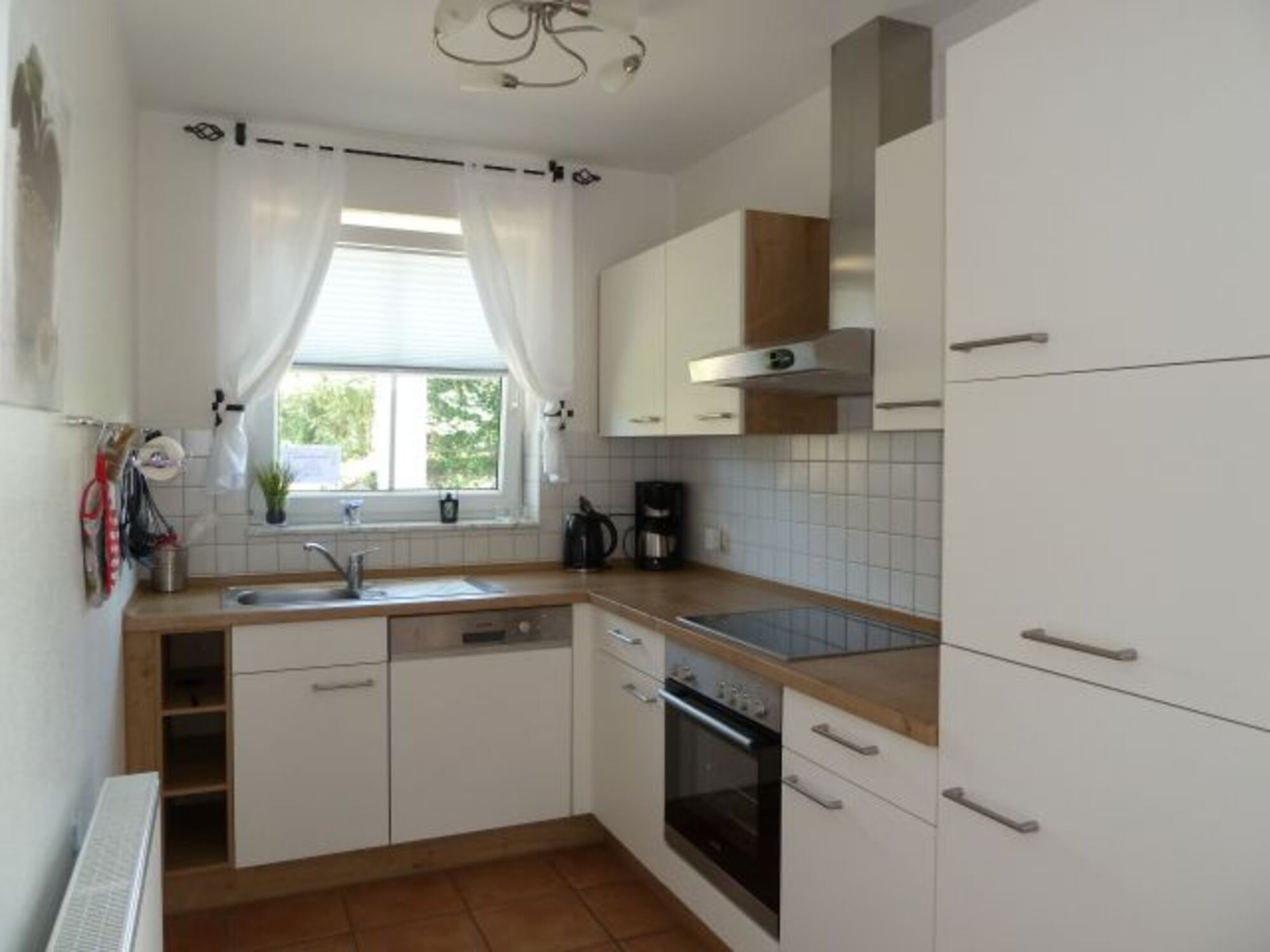 Cerankochfeld, Dunstabzugshaube, Kühlschrank mit Gefrierfach, Senseo-Kaffeeautomat, Eierkocher, Mixer, Korkenzieher / Flaschenöffner, Gewürze (Salz, Pfeffer, Zucker), Geschirrhandtücher, Mülltüten, Essplatz in der Küche
