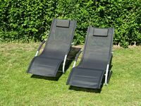 Die Sonnen-Terrasse mit Gartenmöbeln, Liegen, Sonnenschirm und Grill lädt zum Entspannen ein.
