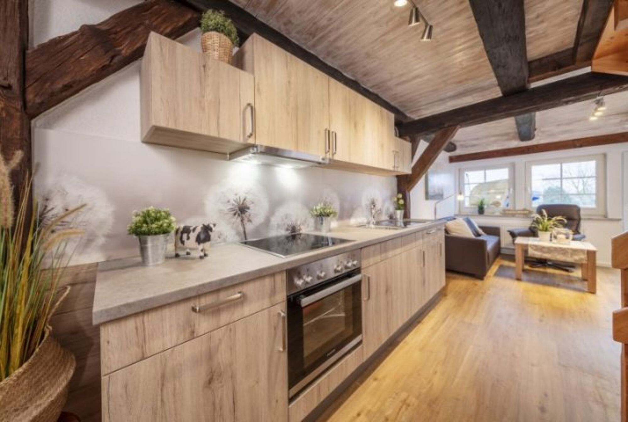 Cerankochfeld, Dunstabzugshaube, Kühlschrank mit Gefrierfach, Eierkocher, Korkenzieher / Flaschenöffner, Geschirrhandtücher, Mülltüten, Essplatz in der Küche