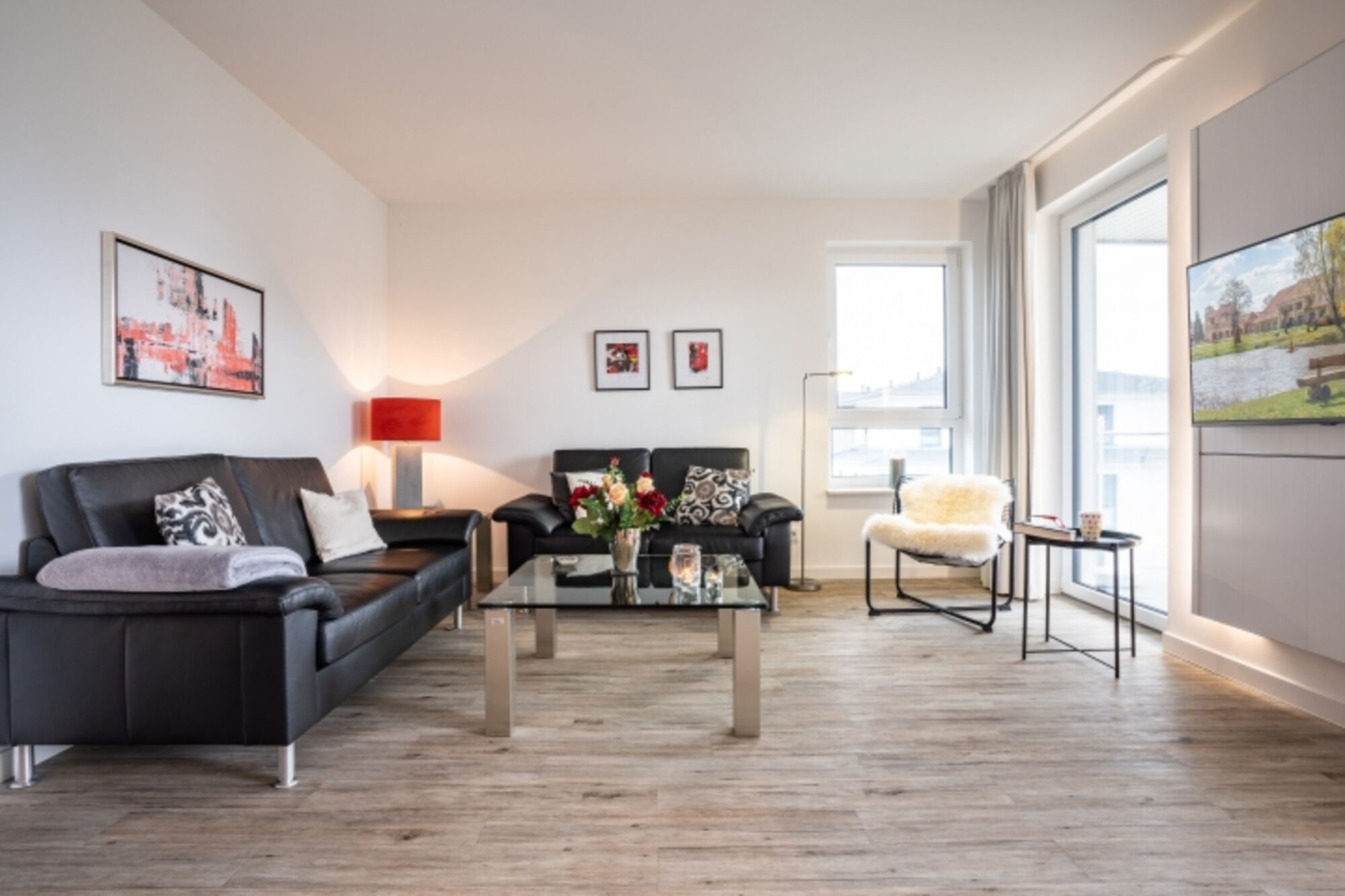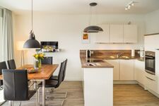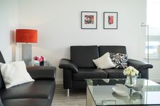 Diese lichtdurchflutete, helle 4-Zimmer-Wohnung im obersten Geschoss von Haus 1 (Aufzug vorhanden) mit Platz für maximal 6 Personen verfügt über eine Wohnfläche von 94 m² und hat 3 Schlafzimmer sowie 2 voll ausgestattete Duschbäder. Die große Sonnenterrasse mit 17 m² liegt in idealer Süd-Ausrichtung. Die Wohnung ist modern eingerichtet mit offenem Wohn-Essbereich, großem Esstisch, Ledersofa sowie Flat-TV (inkl. Sky-Abo). Die hochwertig ausgestattete Küche, offen zum Wohnbereich, lässt keine Wünsche offen. Erholsamer Schlaf in den beiden Schlafzimmern mit Boxspringbetten und Flat-TV ist garantiert. Im dritten Schlafzimmer befindet sich ein bequemes Schlafsofa (Liegefläche: 1,60 x 2,00 m), Schreibtisch und ein Flat-TV. Auf der großen, überdachten Sonnenterrasse mit Essgruppe und jeweils zwei Relax-Sesseln mit Fußhockern sowie einem Sonnenschirm können Sie die Seele baumeln lassen.