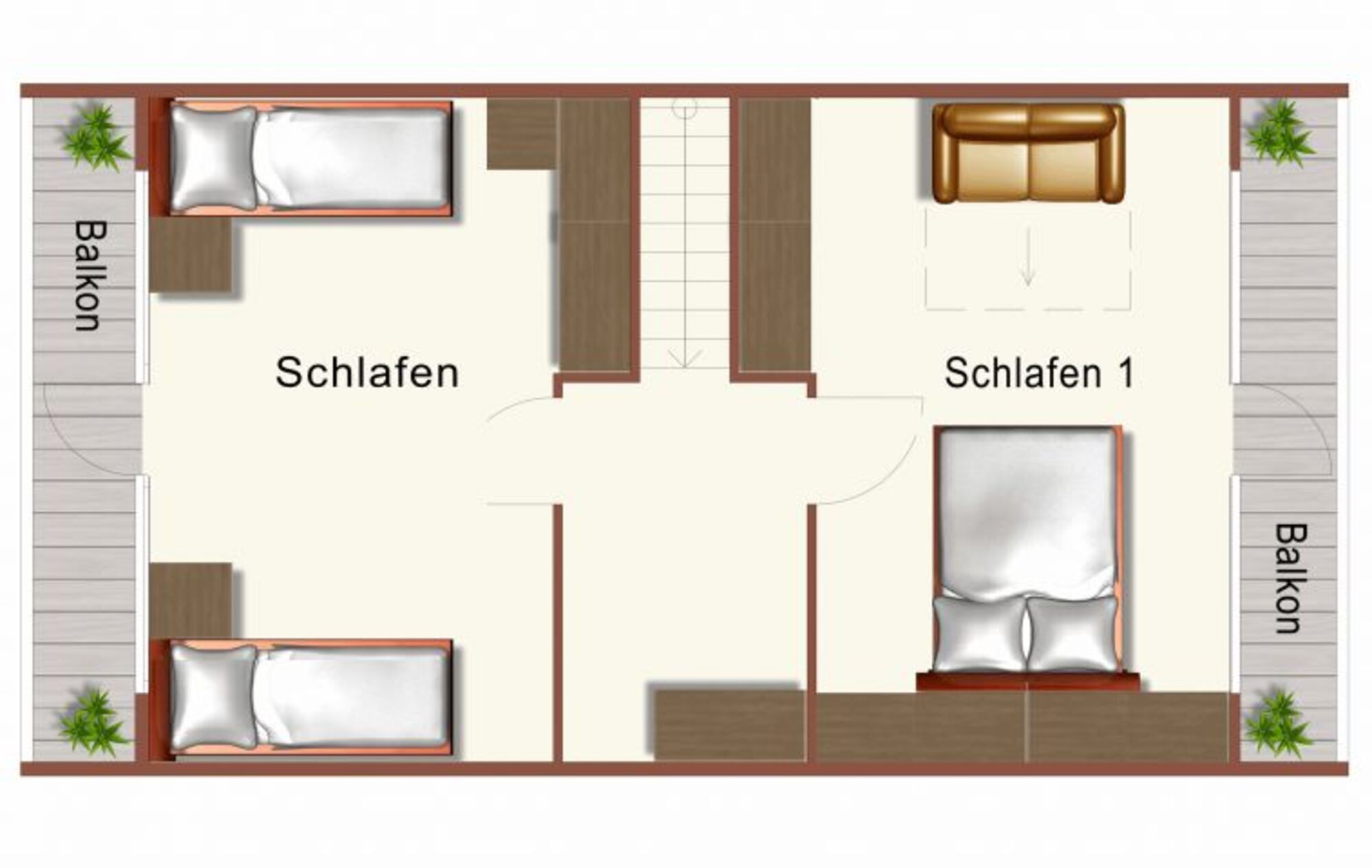 Beide Schlafzimmer befinden sich im ersten Stock und verfügen über einen kleinen Balkon. Das erste Schlafzimmer ist mit einem großen Doppelbett ausgestattet - hier befindet sich auch eine Schlafcouch auf der zwei Personen bequem Platz finden. Im zweiten Schlafzimmer finden Sie 2 bequeme Einzelbetten.
