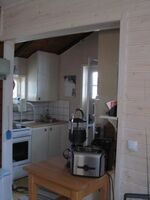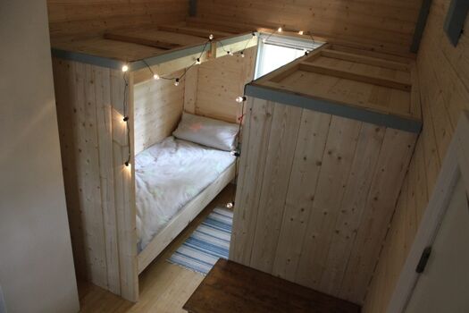 Das Häuschen hat einen gemütlichen Wohnraum mit integrierter Küche und zwei Schlafzimmer. Es hat hohe Decken.