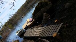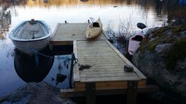 Unser Bootssteg befindet sich nicht direkt am Haus. Man geht den Waldweg runter, an einem Nachbarhaus vorbei und biegt dann bei einem großen Felsen in einen Trampelpfad ein. Nach wenigen Metern befindet man sich an unserem Bootssteg.
