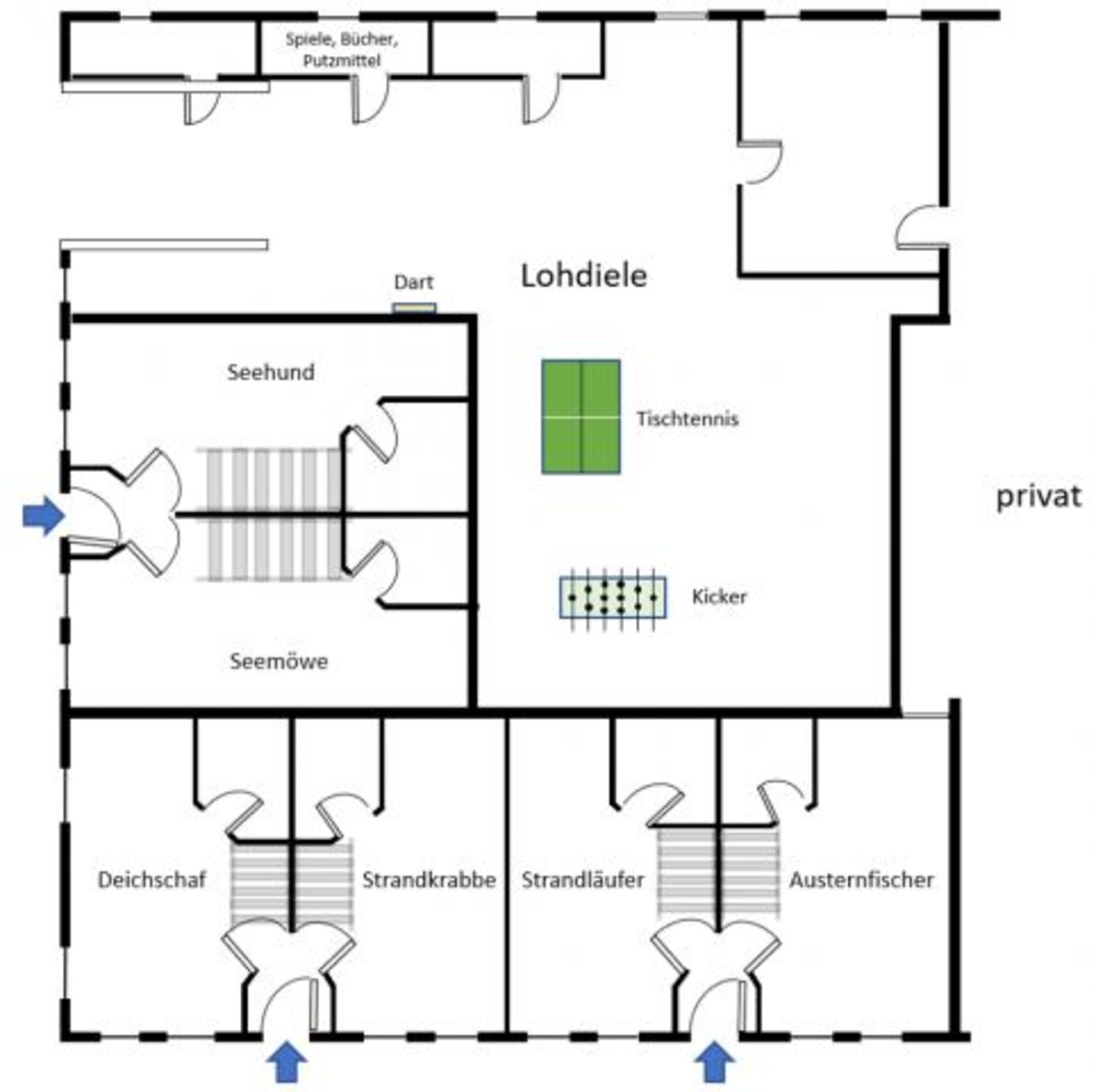 Ein Kicker und eine Dartscheibe befinden sich in der großen Lohdiele.