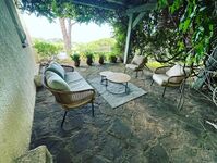 Das ca. 2400 qm große Grundstück ist eingezäunt. Der private Pool mit Alarmanlage ist ca. 4 m x 8 m groß im Oval (Tiefe: 1,50 bis 2,20 m). Es stehen ausreichend Gartenmöbel und feste stationäre Holzkohlegrill/Holzfeuerstellen sowie ein Gasplanchagrill zur Verfügung.