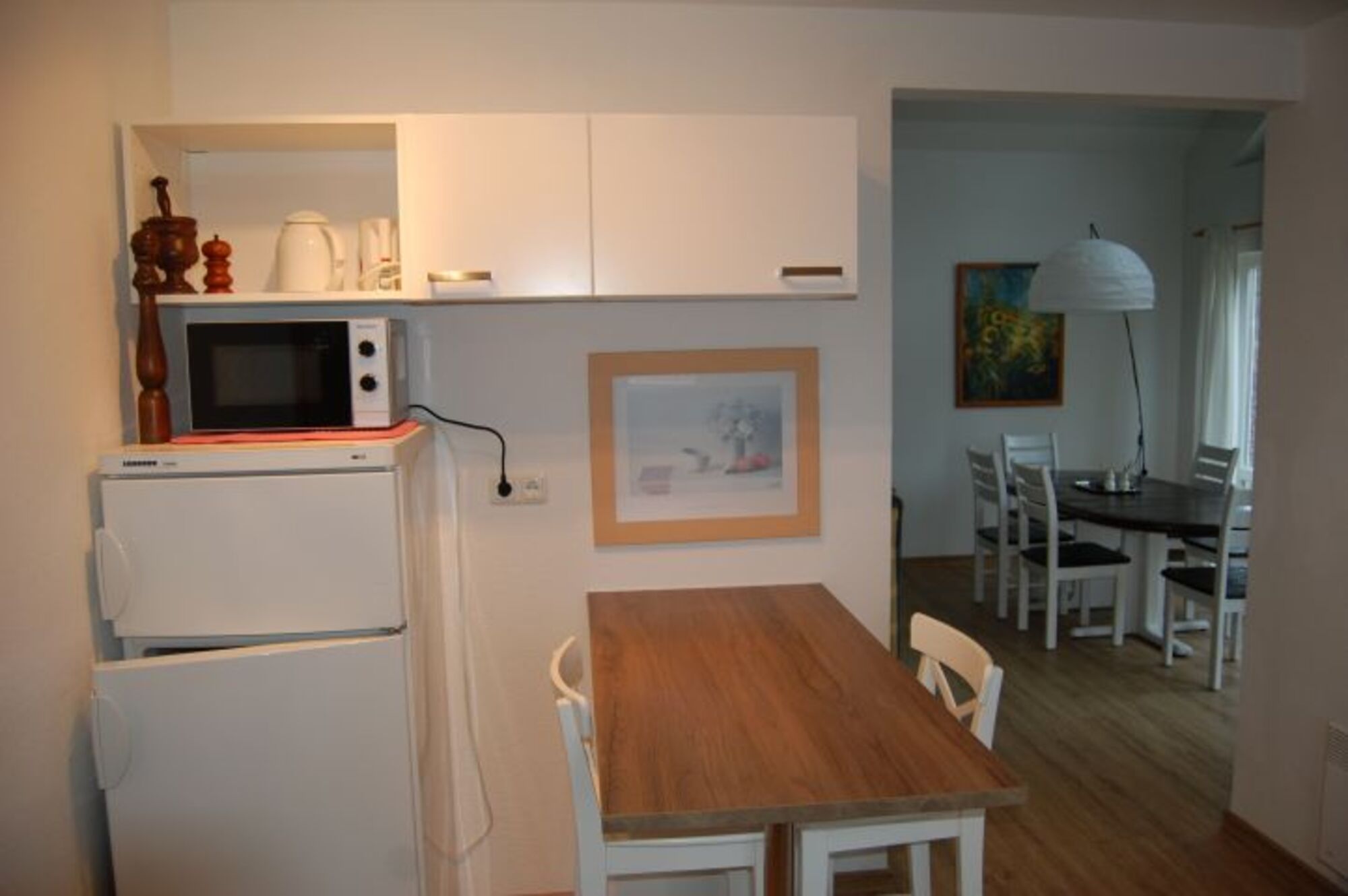 Cerankochfeld, Dunstabzugshaube, Kühlschrank mit Gefrierfach, Küchenmaschine, Korkenzieher / Flaschenöffner, Gewürze (Salz, Pfeffer, Zucker), Mülltüten, Essplatz in der Küche