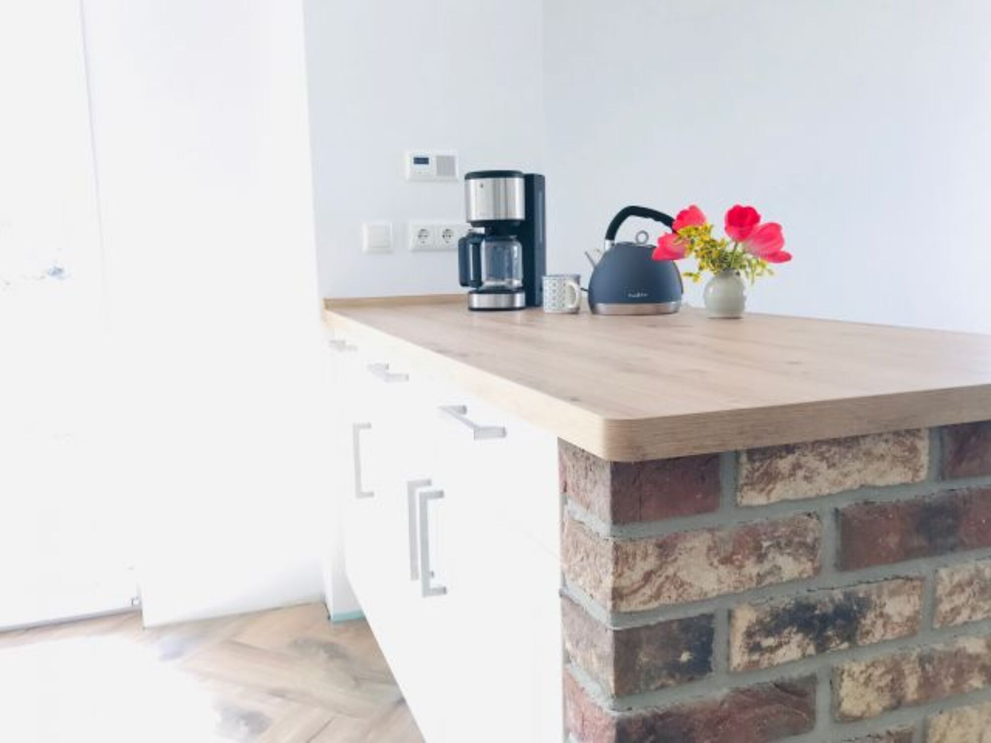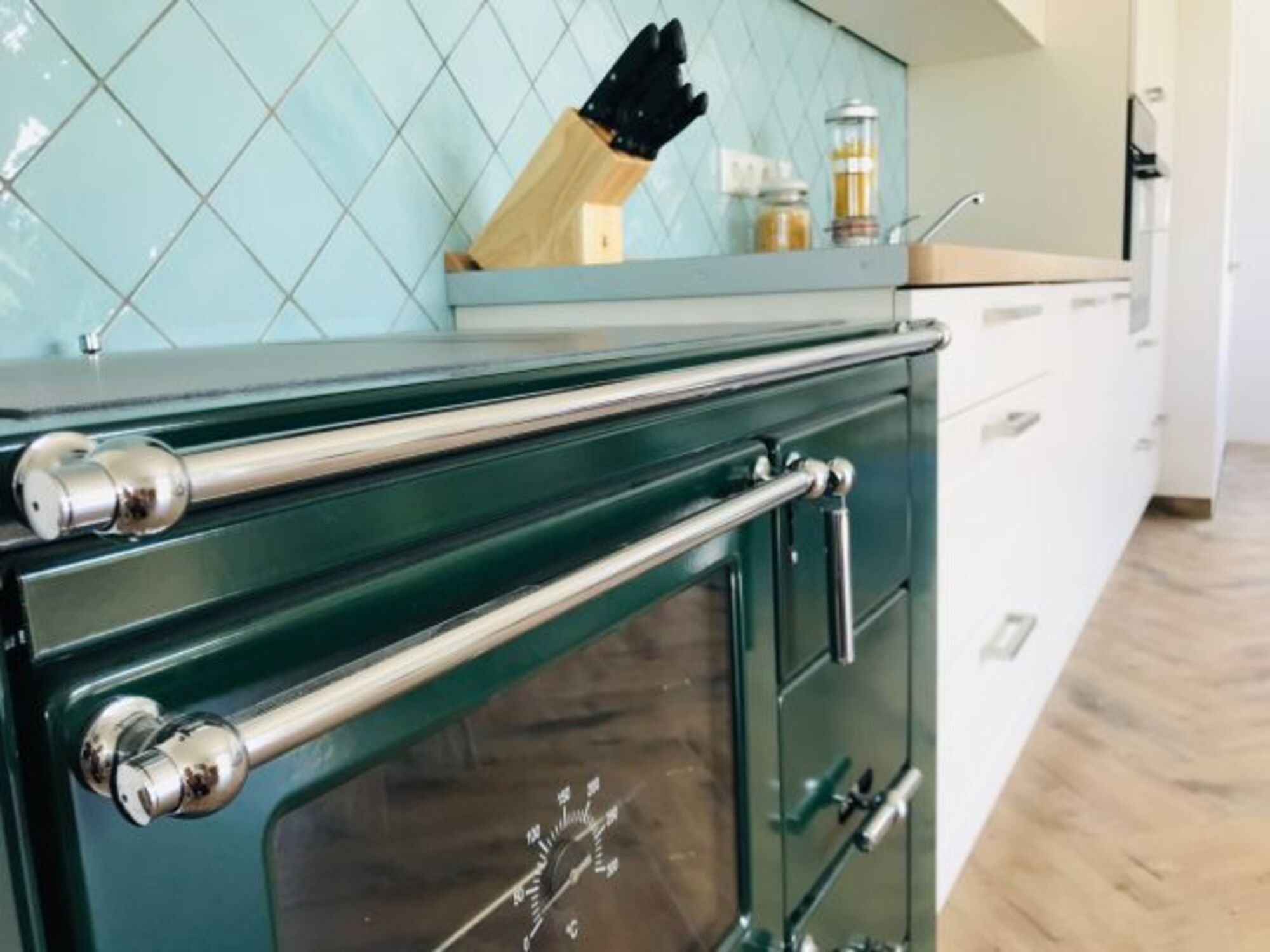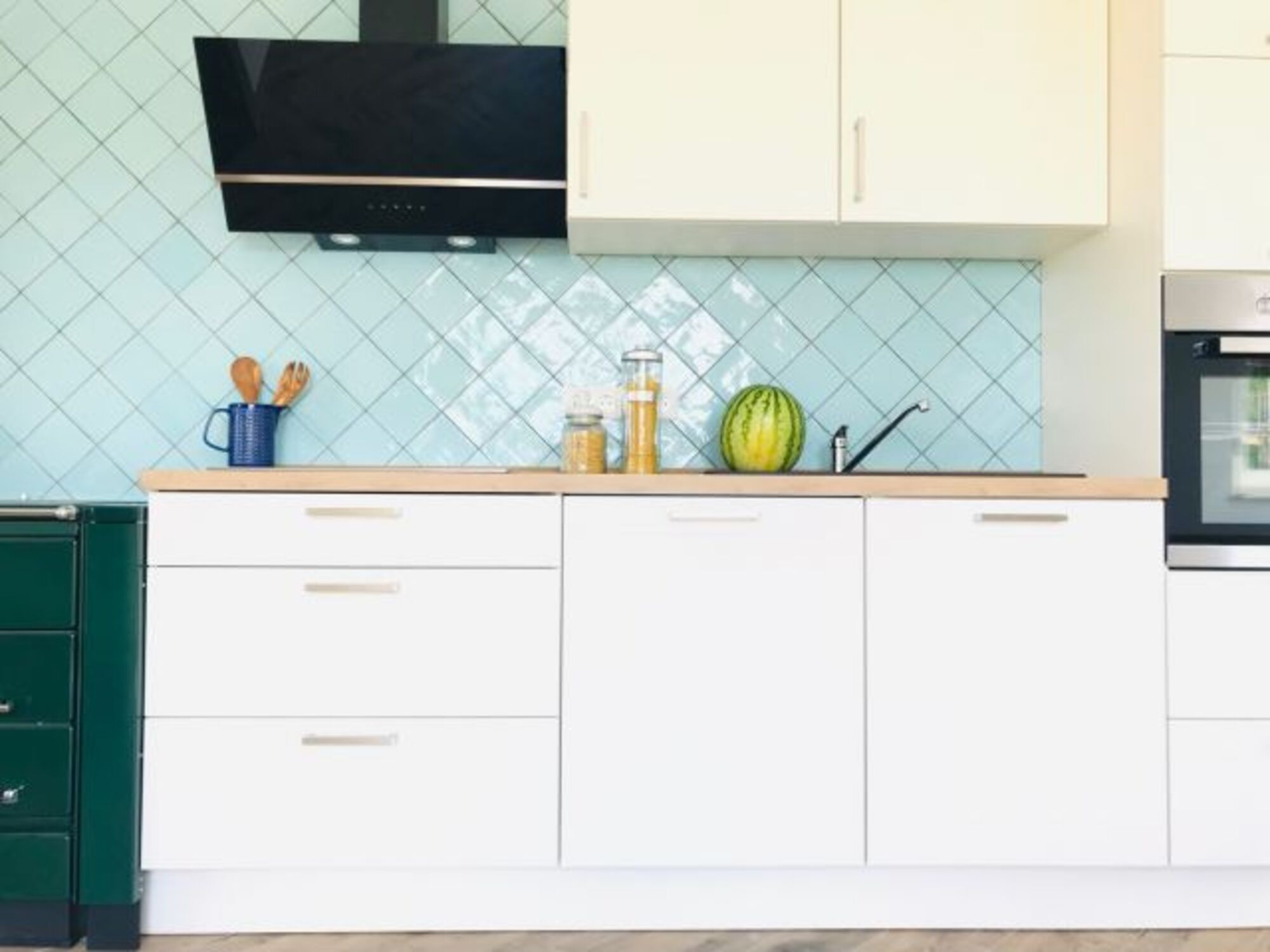 Cerankochfeld, Dunstabzugshaube, Kühlschrank mit Gefrierfach, Eierkocher, Mixer, Korkenzieher / Flaschenöffner, Gewürze (Salz, Pfeffer, Zucker), Öl / Essig, Mülltüten, Essplatz in der Küche