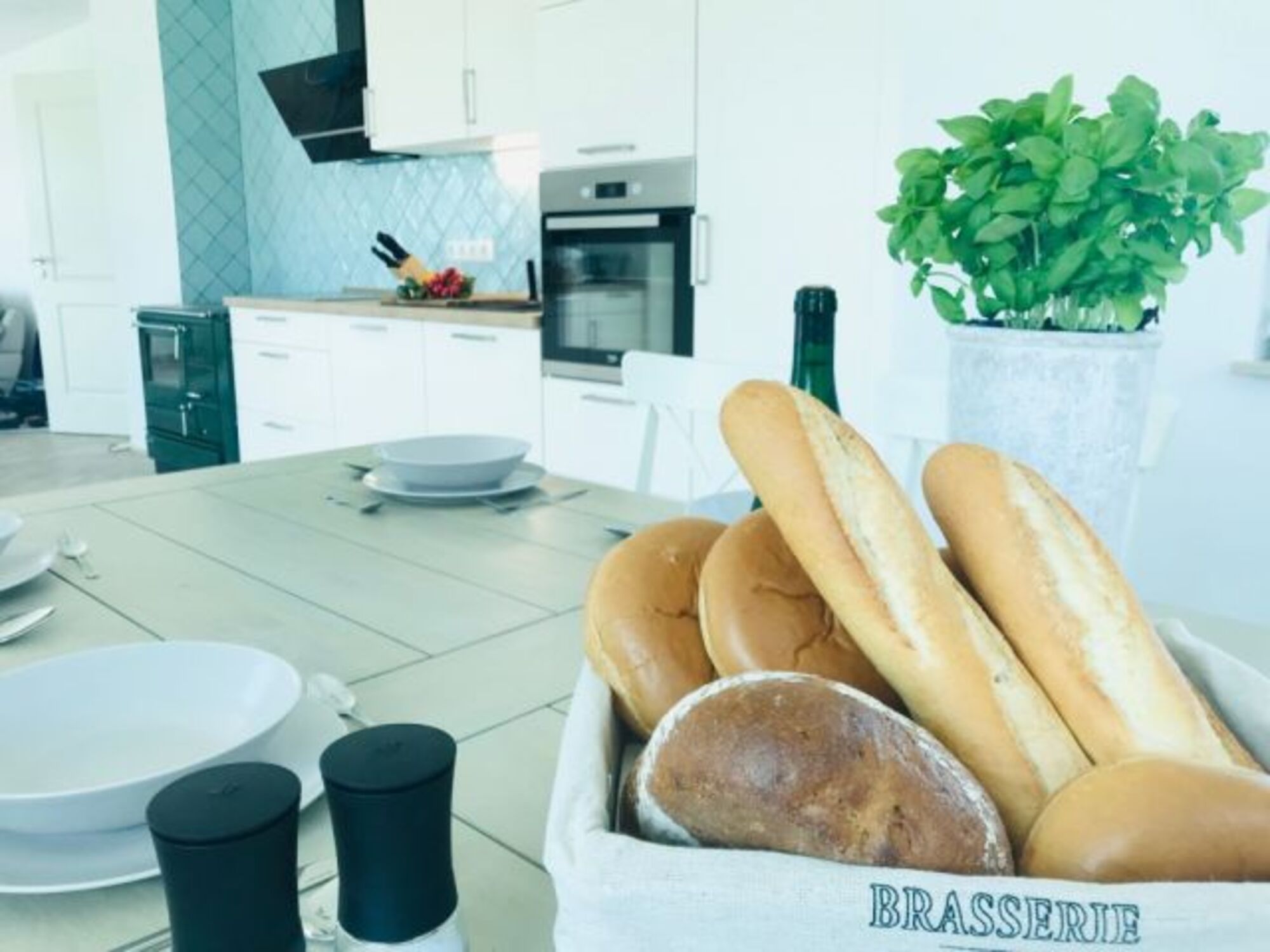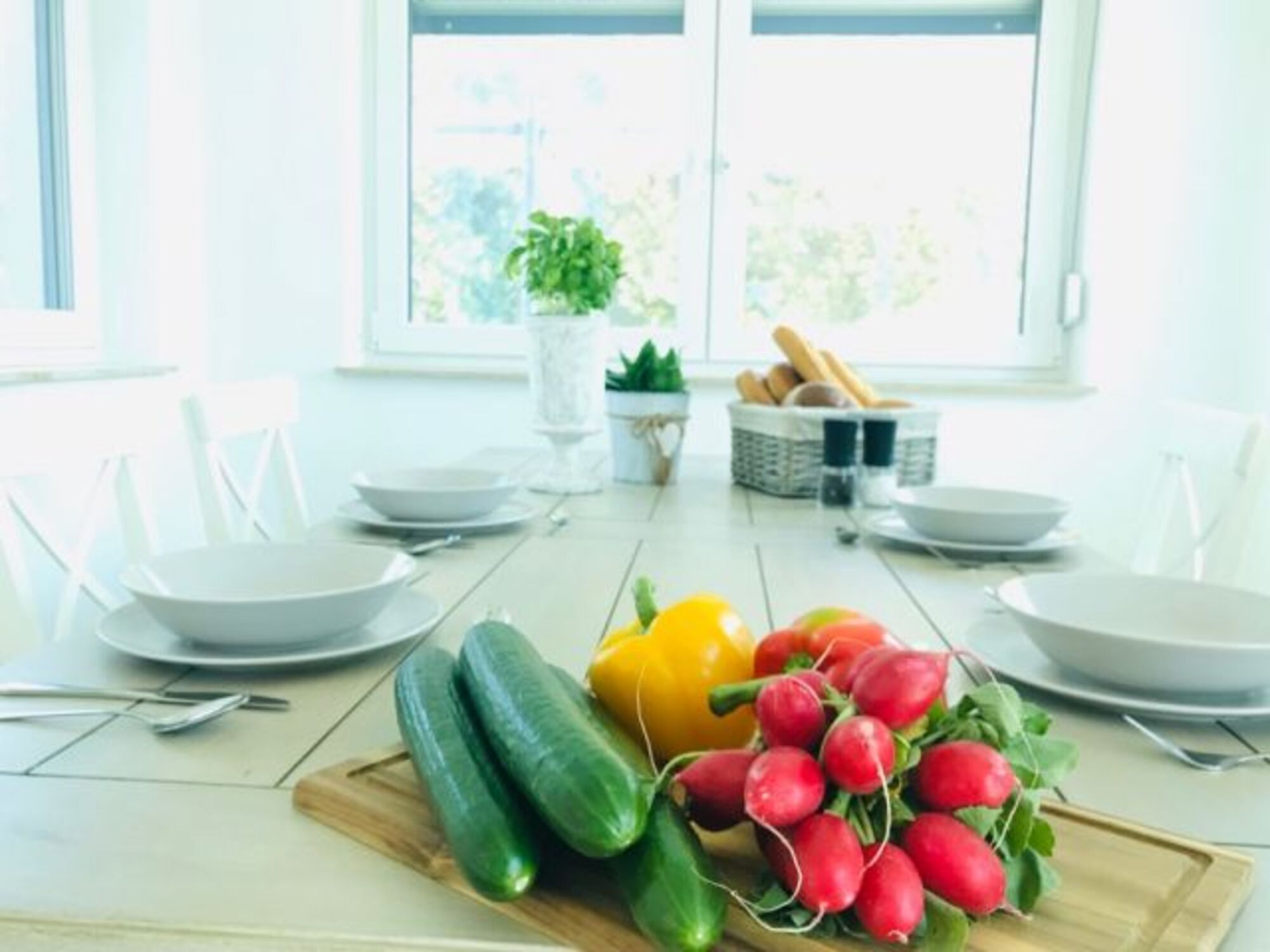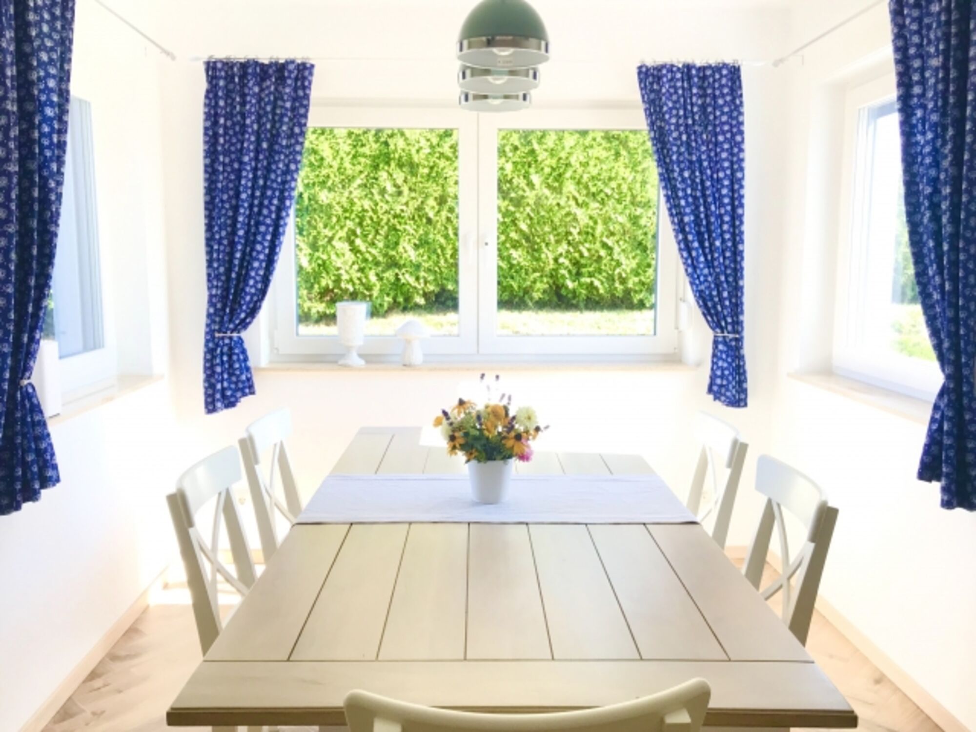 Cerankochfeld, Dunstabzugshaube, Kühlschrank mit Gefrierfach, Eierkocher, Mixer, Korkenzieher / Flaschenöffner, Gewürze (Salz, Pfeffer, Zucker), Öl / Essig, Mülltüten, Essplatz in der Küche