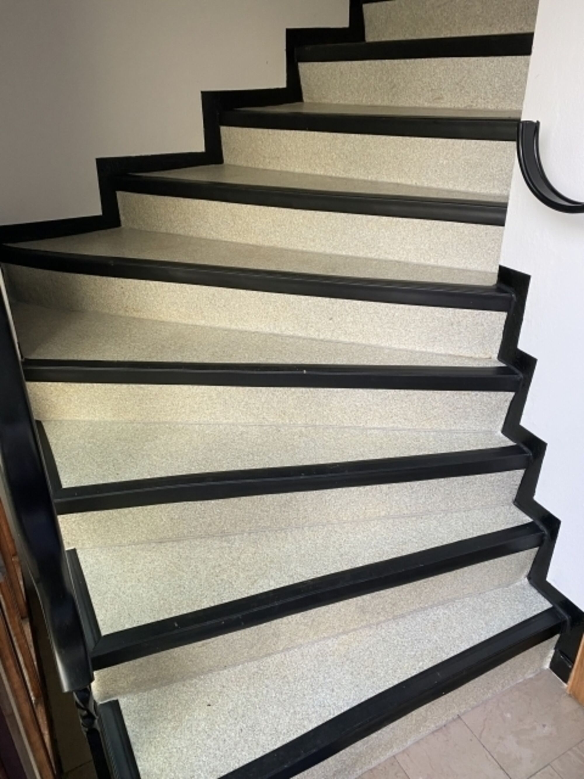 Eine massive Betontreppe führt ins Obergeschoss. Bitte beachten Sie, dass die Treppe etwas verkürzte Stufen hat. (siehe Bilder)