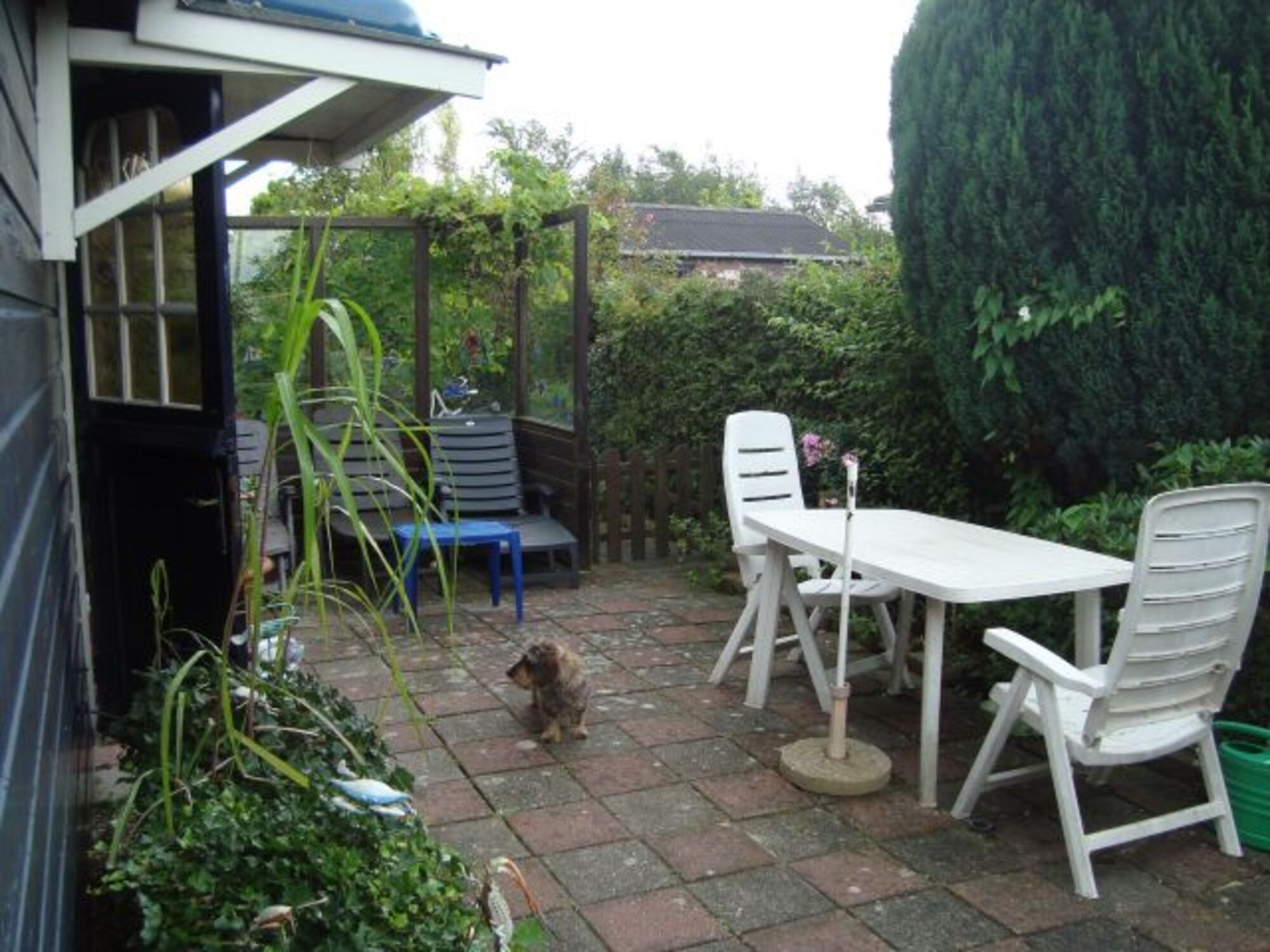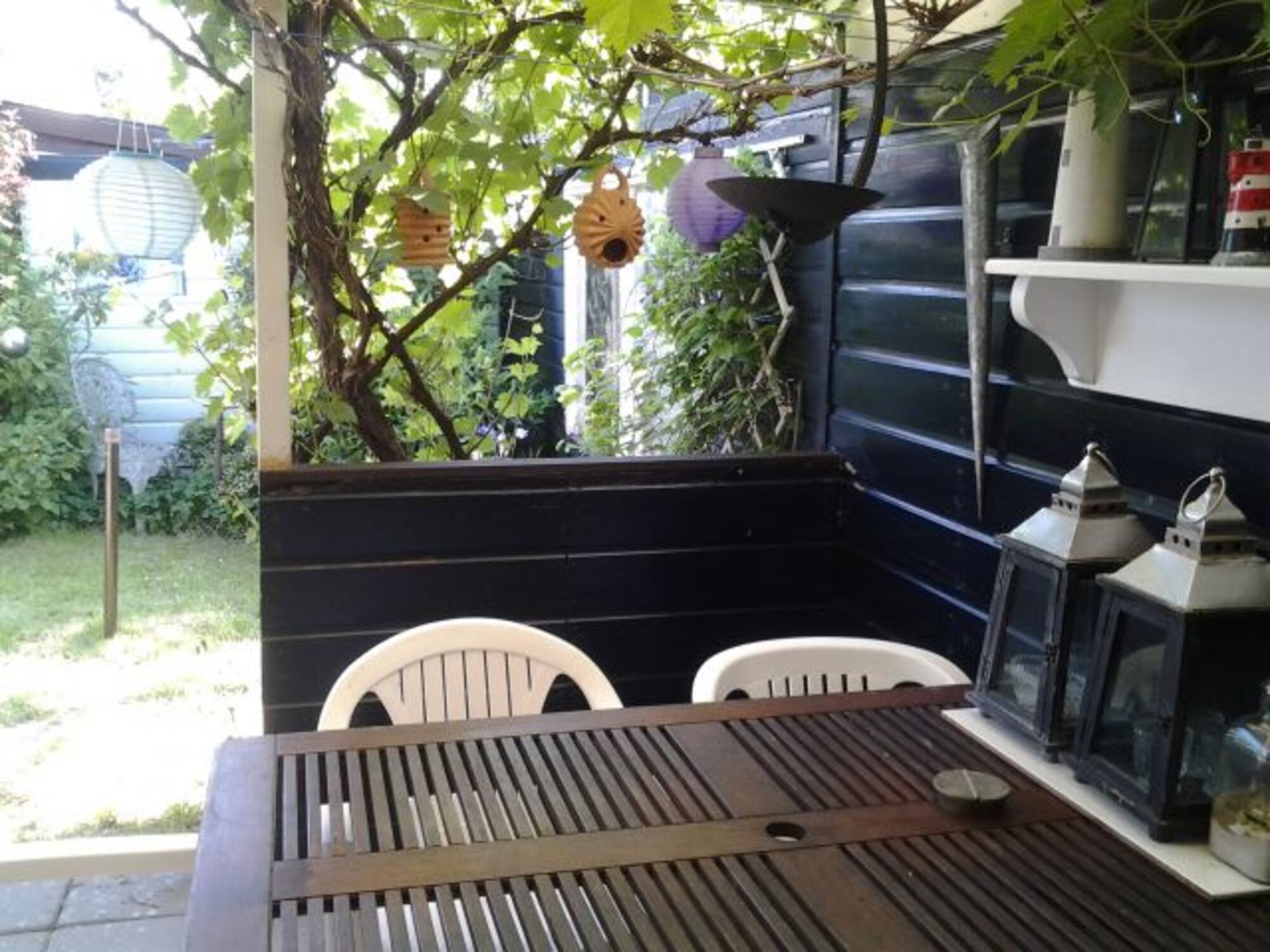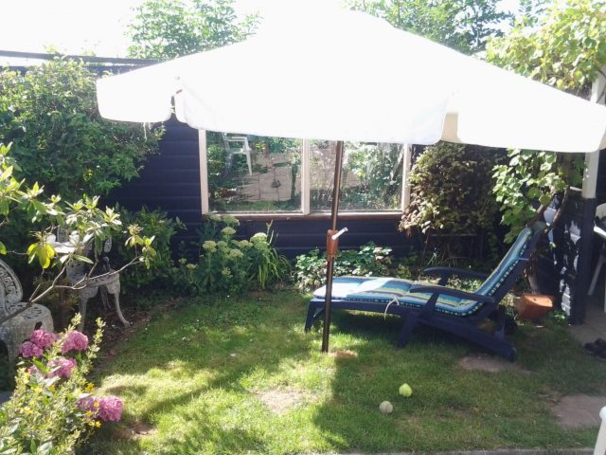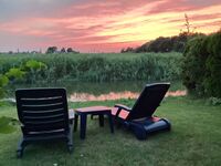 Garten mit großer Terrasse, teilweise überdacht/windgeschützt, Gartenliegen, Gartentische und -stühle, Grill, Sonnenschirme etc. Zugang (sicher verschließbar) zur den Park begrenzenden Gracht mit Möglichkeit zum Angeln, Bootfahren.