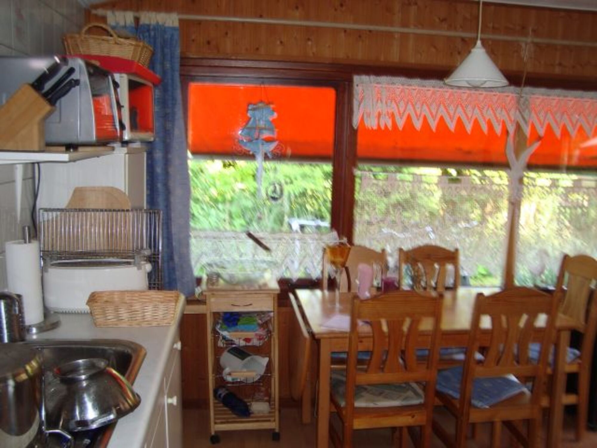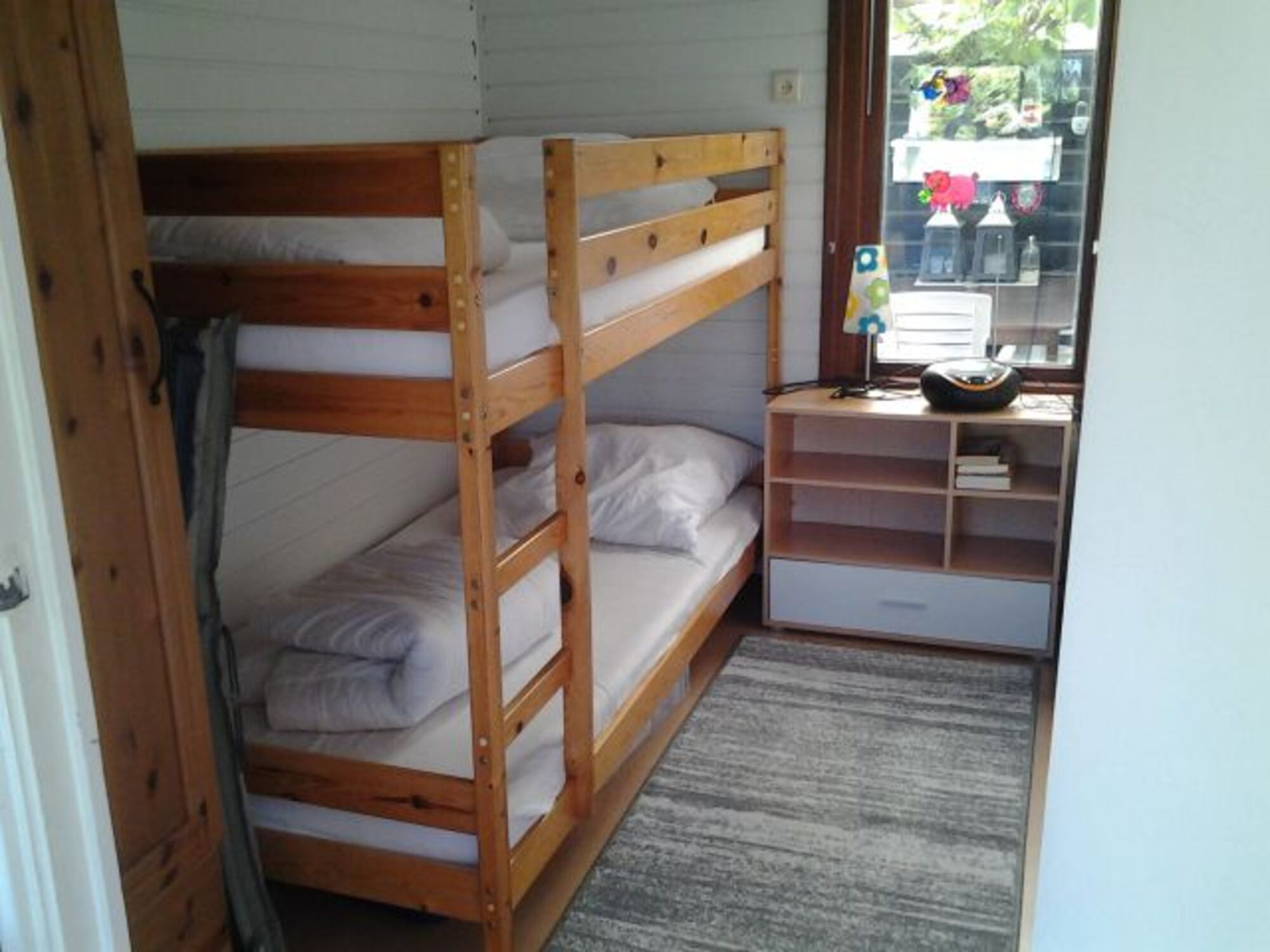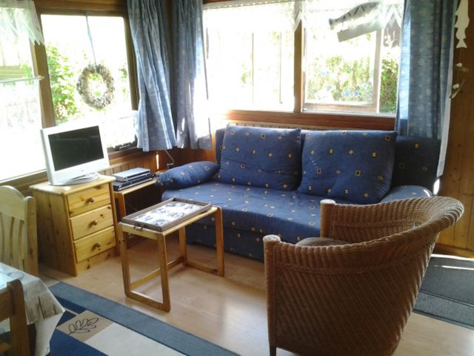 1 Schlafzimmer (1 x 140er Doppelbett), 1 Schlafzimmer mit 100er-Etagendoppelbett, ein Schlafsofa für zwei Personen im Wohnzimmer. Kombiniertes Wohnzimmer mit Einbauküche. Flachbild-SAT-Fernseher mit DVD-Player, Radio, CD. Separates Badezimmer mit Dusche/Waschbecken/Toilette/Waschmaschine. Voll ausgestattet mit allen Küchengeräten, Herd, kleinem Backofen, Microwelle, Kaffeemaschine, Toaster, Wasserkocher etc.