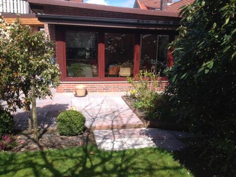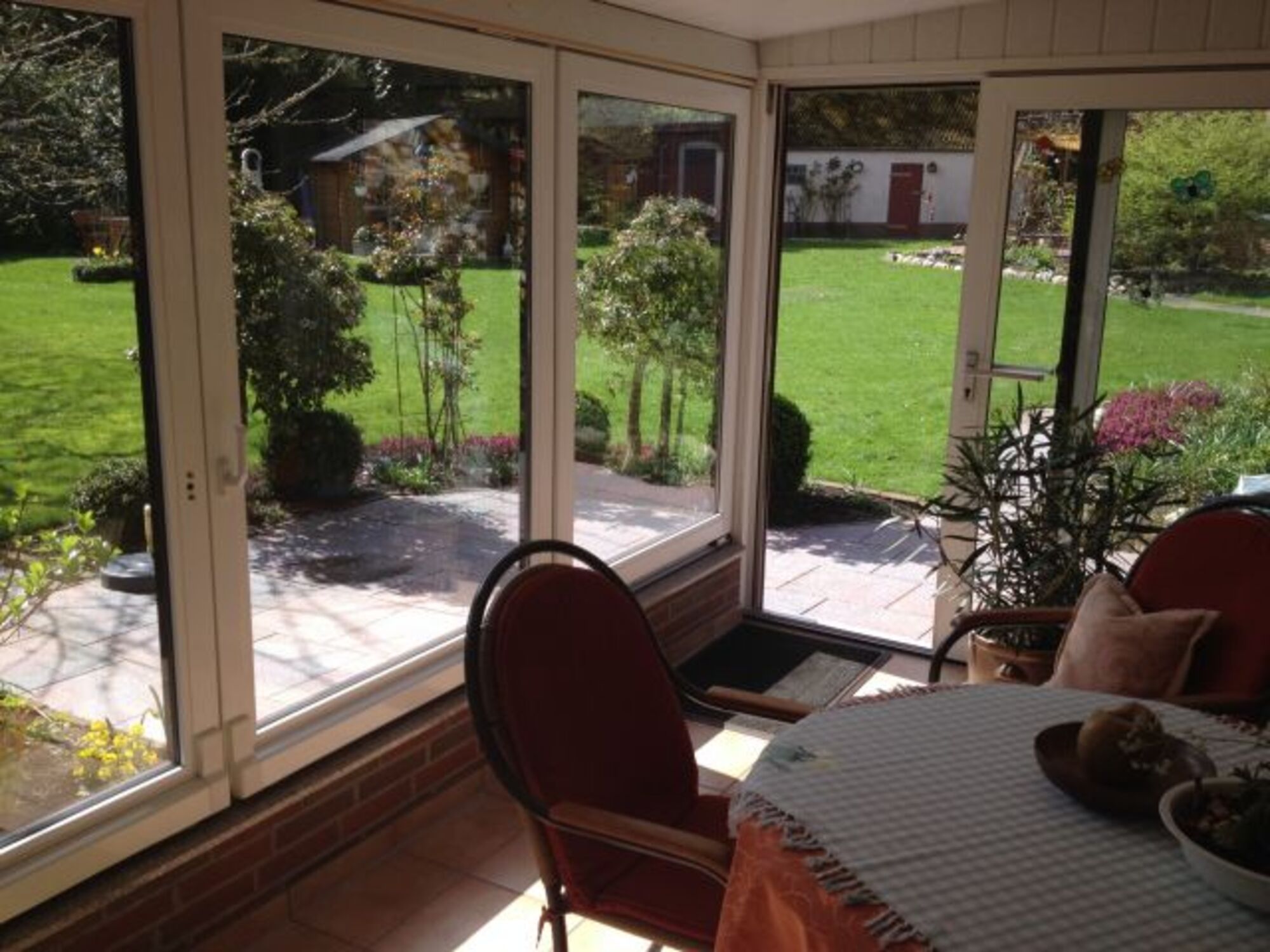 Schöner grosser und beheizbarer Wintergarten mit wunderbarem Blick in den grossen Garten und angrenzenden Wald. Eigener Eingang und Carport Parkplatz direkt vor der Tür. Grillplatz mit Gartenhütte.