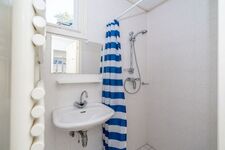 Durch den Flur gelangen Sie auch in das Badezimmer mit Dusche und Waschbecken. Der Bungalow hat eine separate Toilette.
