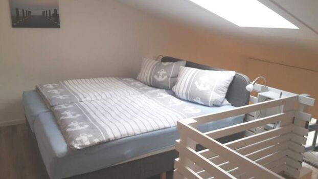 Unsere "Komfort " Ferienwohnung hat ein Schlafzimmer mit gemütlichen Boxspring Doppelbetten (1,8x2,0m Liegefläche) auf unsere offenen Galerie und ein Schlafzimmer mit zusätzlichem Boxspringbett und Infrarotkabine.
